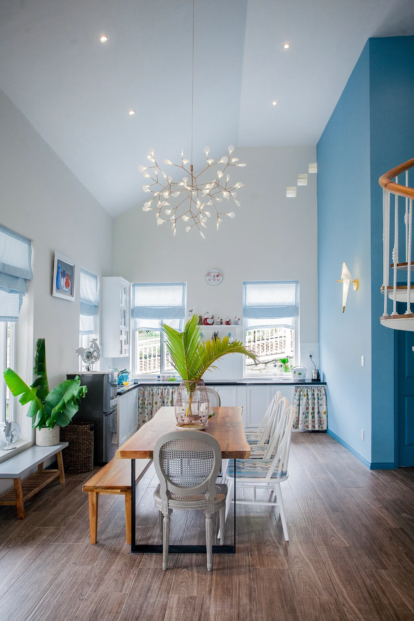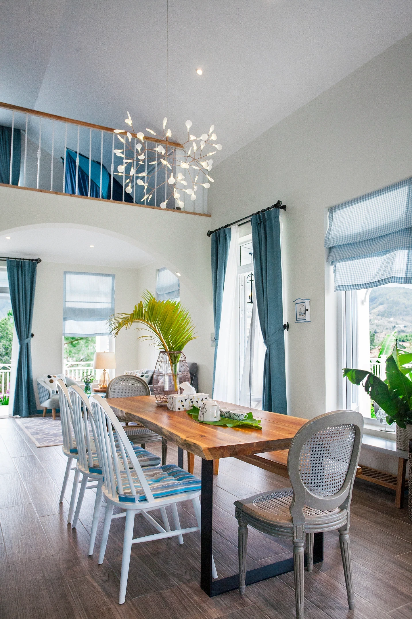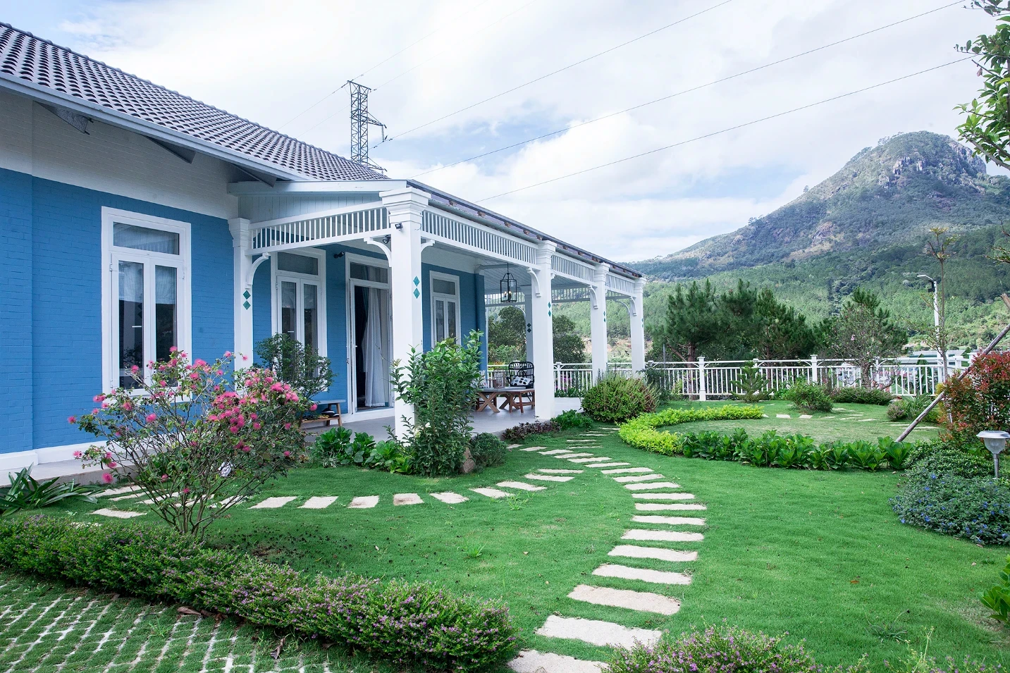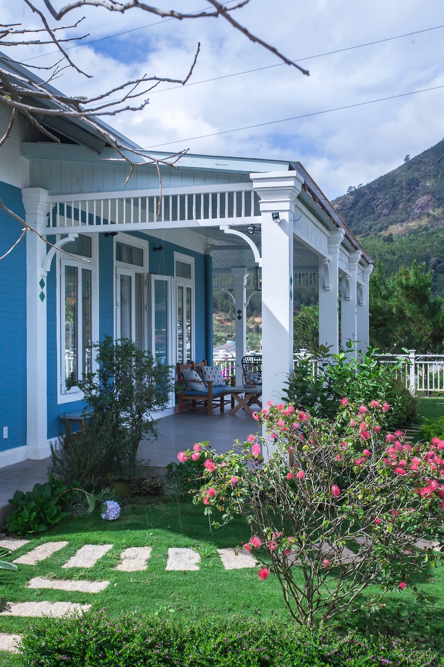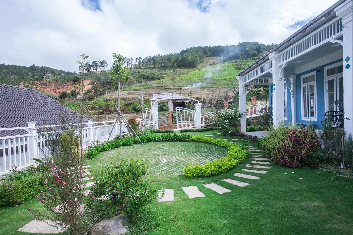 Công trình nằm trên một ngọn đồi nhỏ, là nơi cả gia đình chọn làm chốn nghỉ dưỡng cuối tuần. Ngôi nhà được thiết kế theo hướng nhẹ nhàng, hòa mình vào thiên nhiên với tông màu trắng xanh – 2 màu yêu thích của chị chủ. Nội thất là sự kết hợp giữa gỗ thông tự nhiên lấy từ Đà Lạt và các chất liệu mềm mại ấm áp, với điểm nhấn là chiếc cầu thang xoắn dẫn lên tầng áp mái – nơi chốn bí mật của tụi nhỏ. Phần sân vườn bao quanh cũng được quy hoạch và thiết kế dựa theo mong muốn trở thành nơi cắm trại, dựng lều mỗi khi gia đình có bạn bè từ nơi khác ghé thăm.