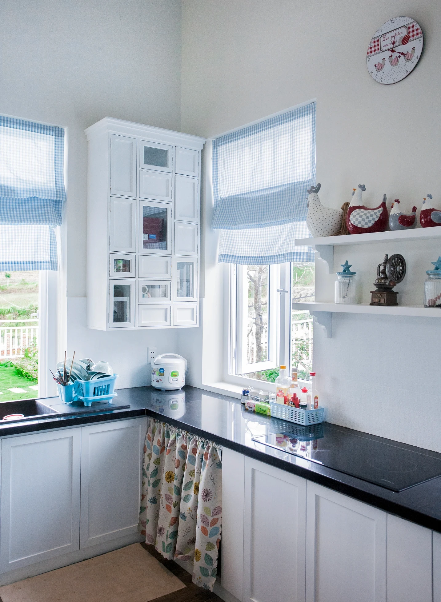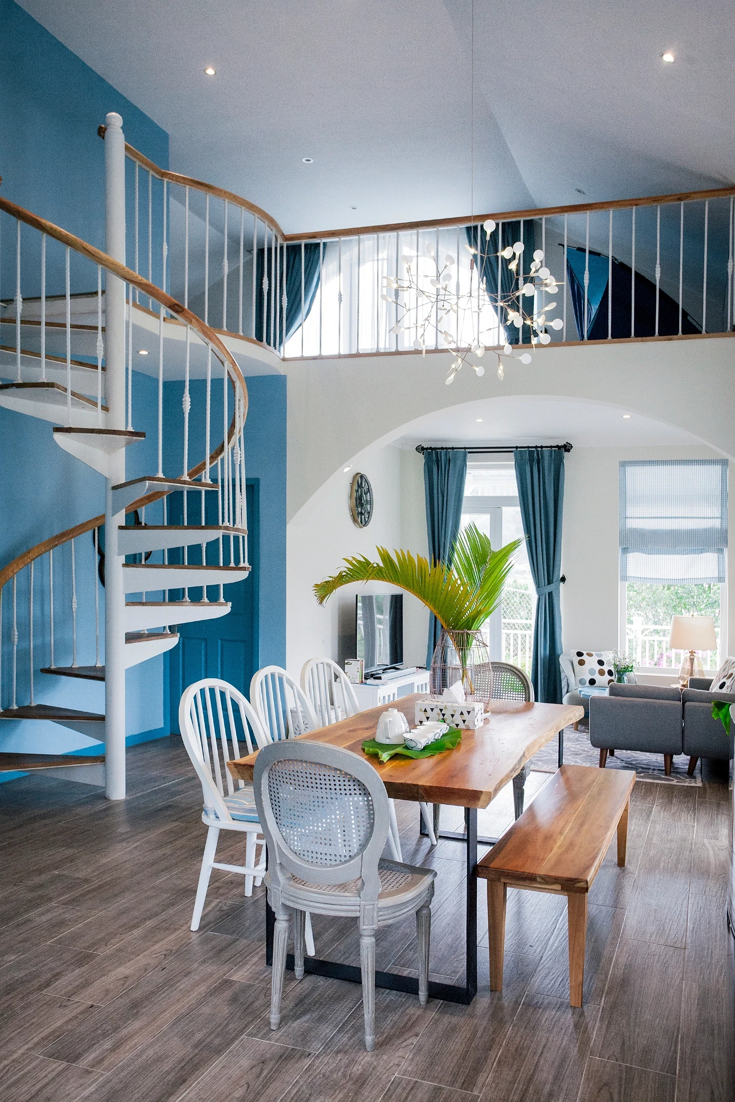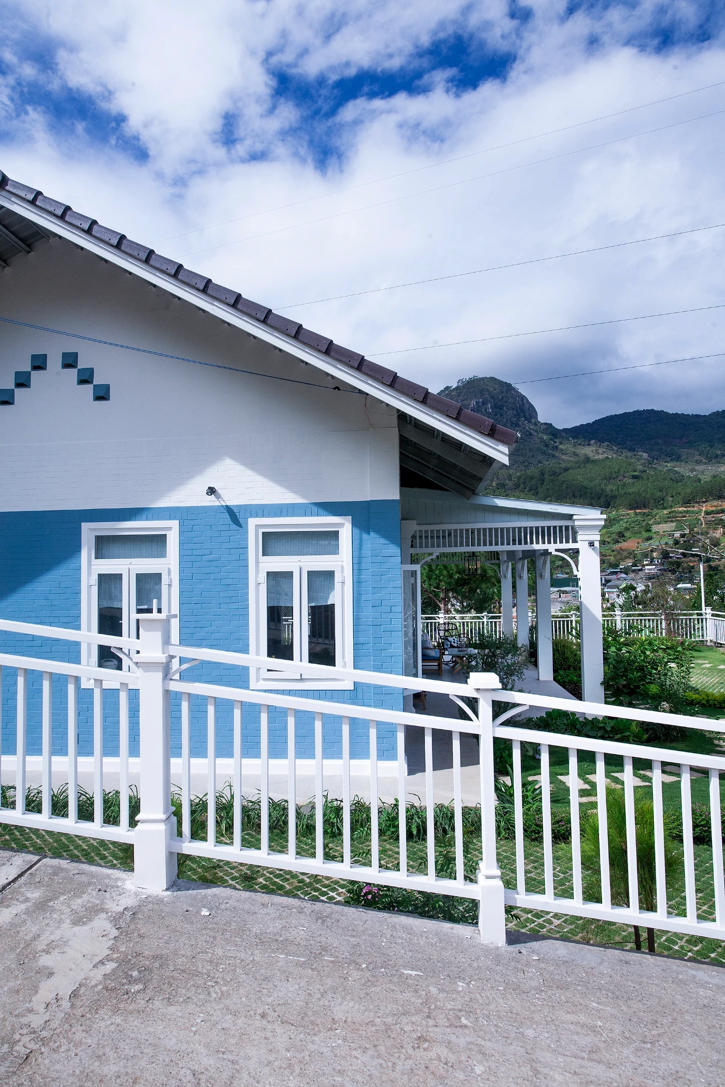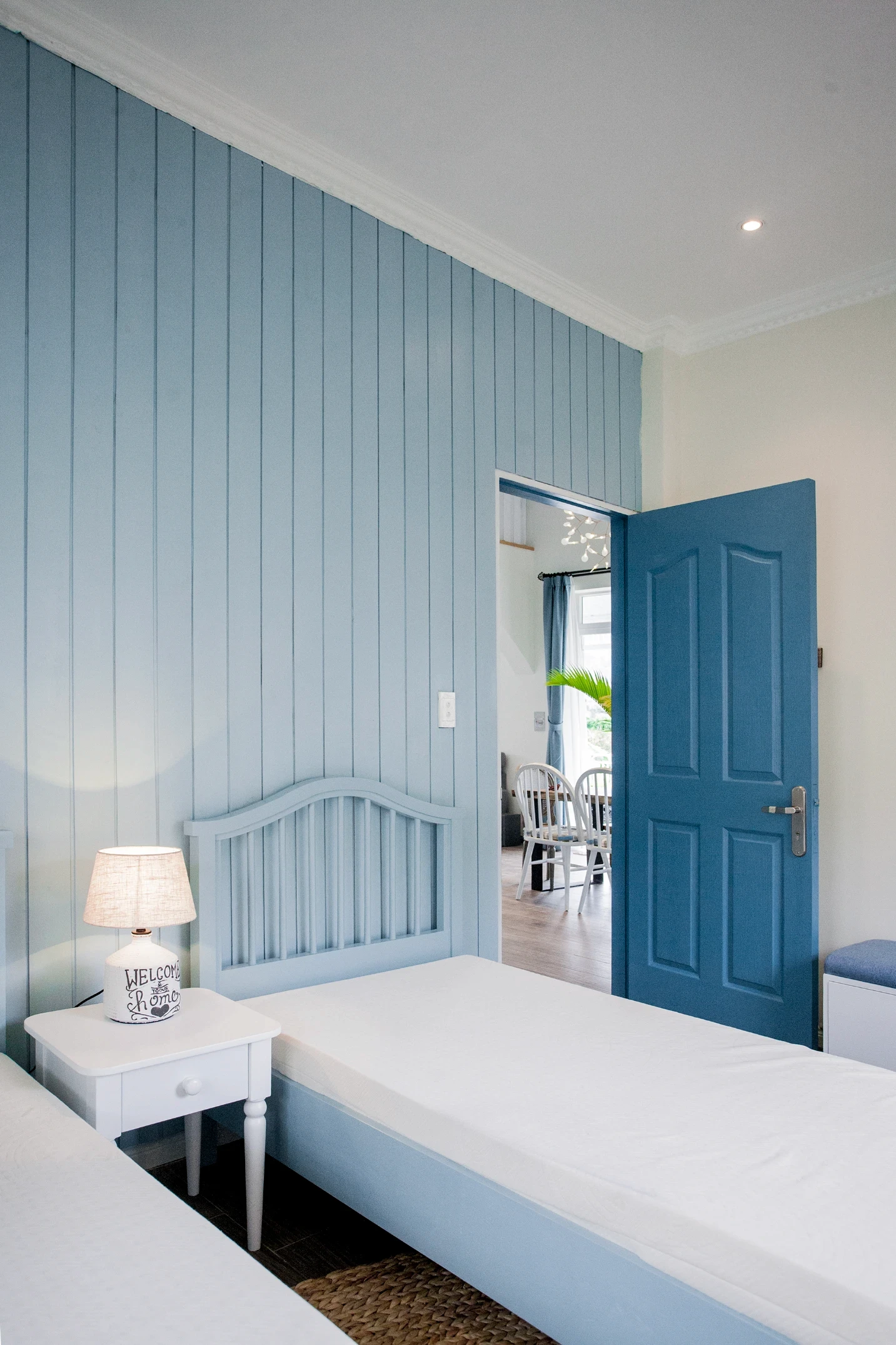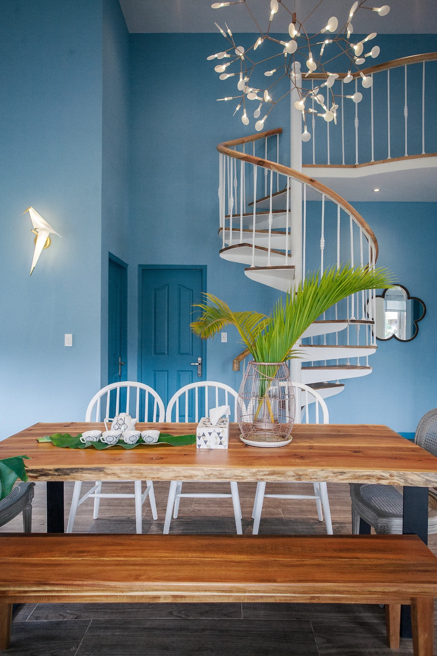 Công trình nằm trên một ngọn đồi nhỏ, là nơi cả gia đình chọn làm chốn nghỉ dưỡng cuối tuần. Ngôi nhà được thiết kế theo hướng nhẹ nhàng, hòa mình vào thiên nhiên với tông màu trắng xanh – 2 màu yêu thích của chị chủ. Nội thất là sự kết hợp giữa gỗ thông tự nhiên lấy từ Đà Lạt và các chất liệu mềm mại ấm áp, với điểm nhấn là chiếc cầu thang xoắn dẫn lên tầng áp mái – nơi chốn bí mật của tụi nhỏ. Phần sân vườn bao quanh cũng được quy hoạch và thiết kế dựa theo mong muốn trở thành nơi cắm trại, dựng lều mỗi khi gia đình có bạn bè từ nơi khác ghé thăm.