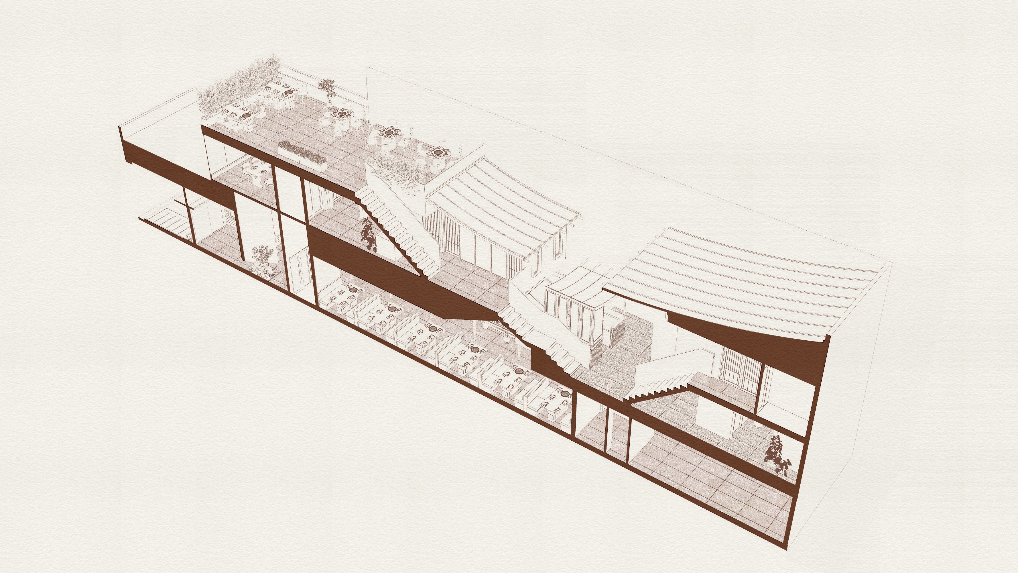 Tận dụng cấu trúc lệch tầng và kết cấu thép của hiện trạng, Dolgabi Saigon mang đến một thiết kế độc đáo lấy cảm hứng từ những ngôi làng Hanok truyền thống Hàn Quốc. Các tầng mái cao thấp đan xen tạo nên nhịp điệu thị giác thú vị, trong khi phần mặt tiền được cắt xéo táo bạo để mở ra khoảng đệm dẫn dắt thực khách đến lối vào chính.