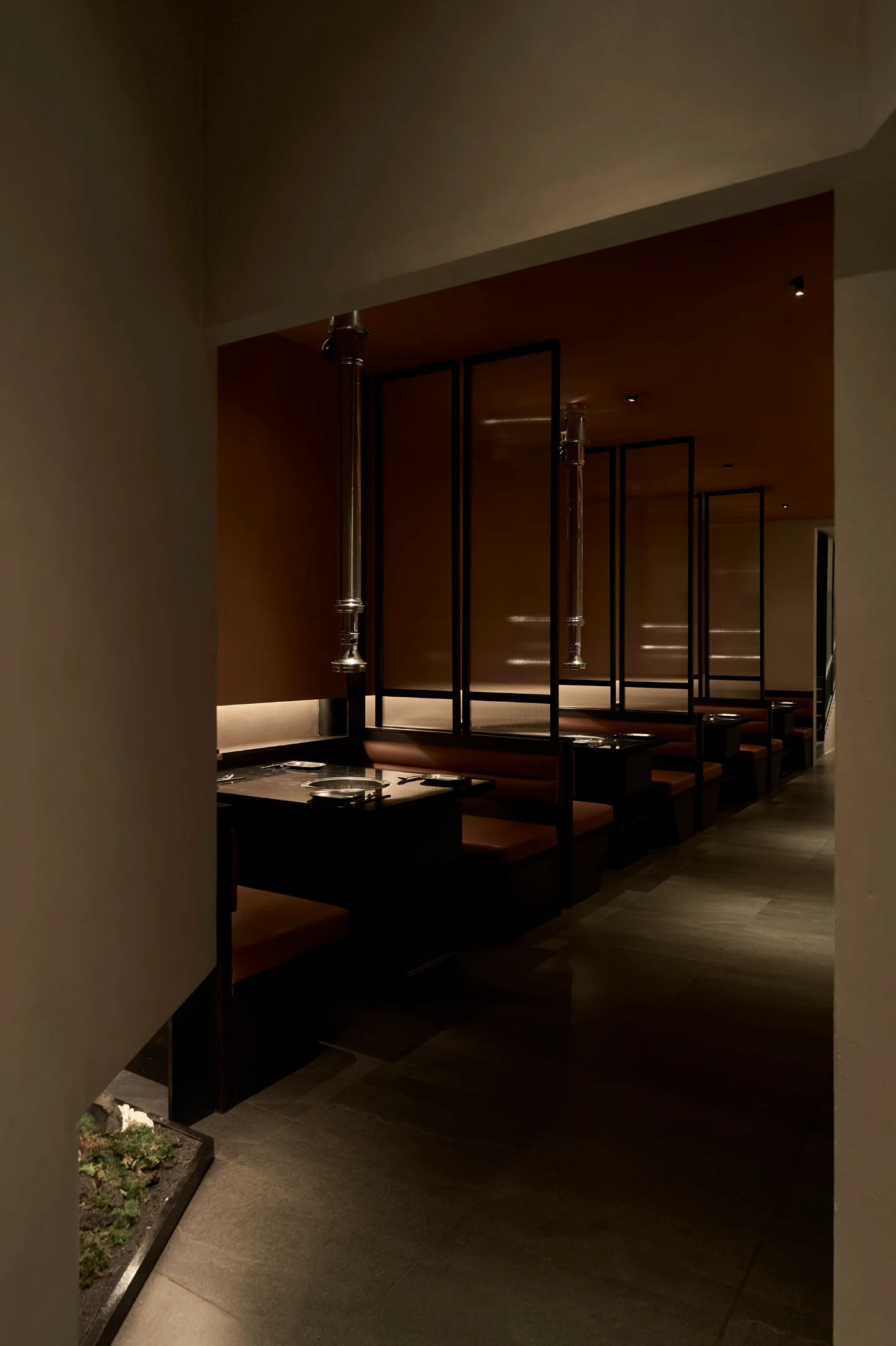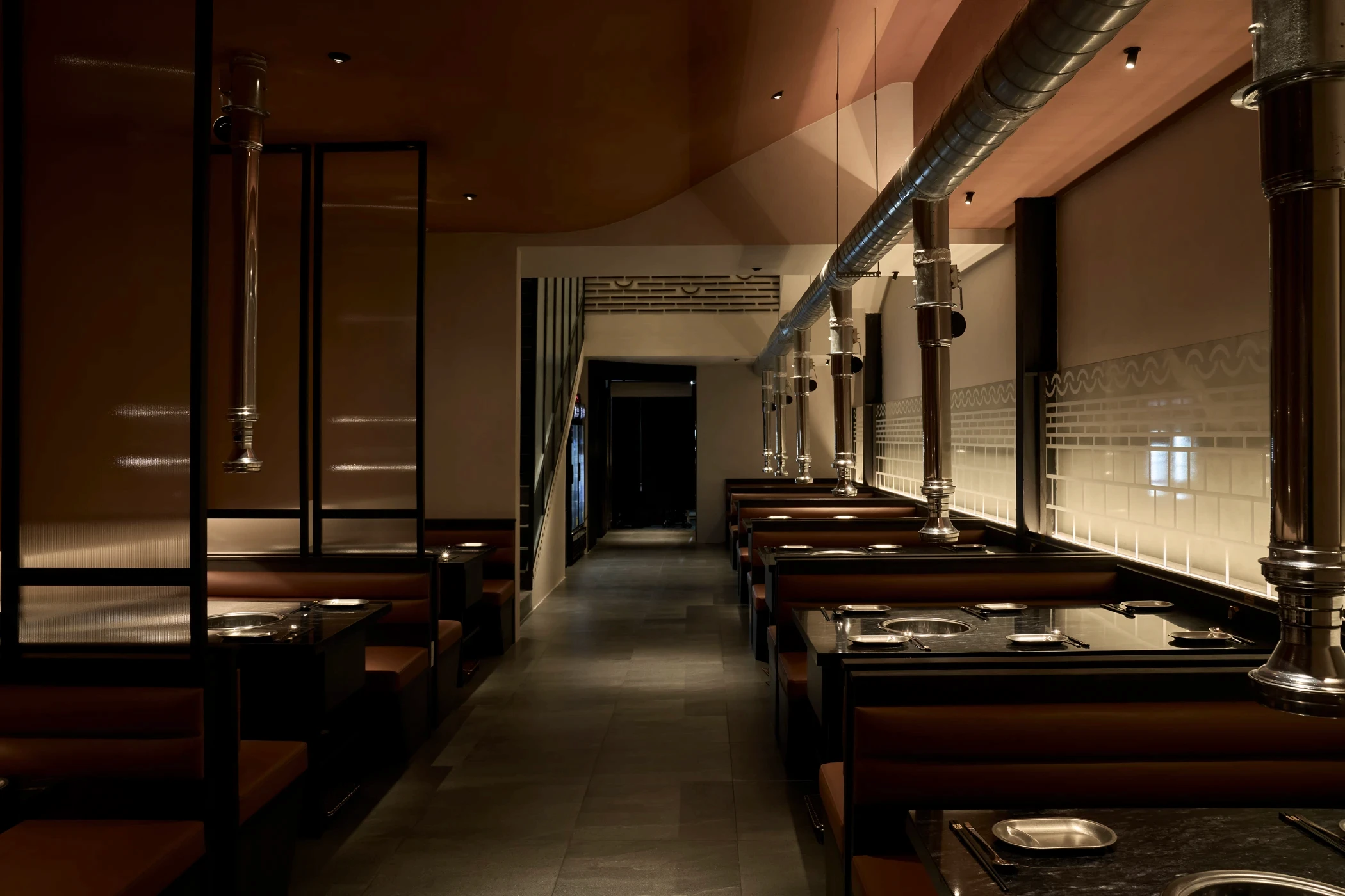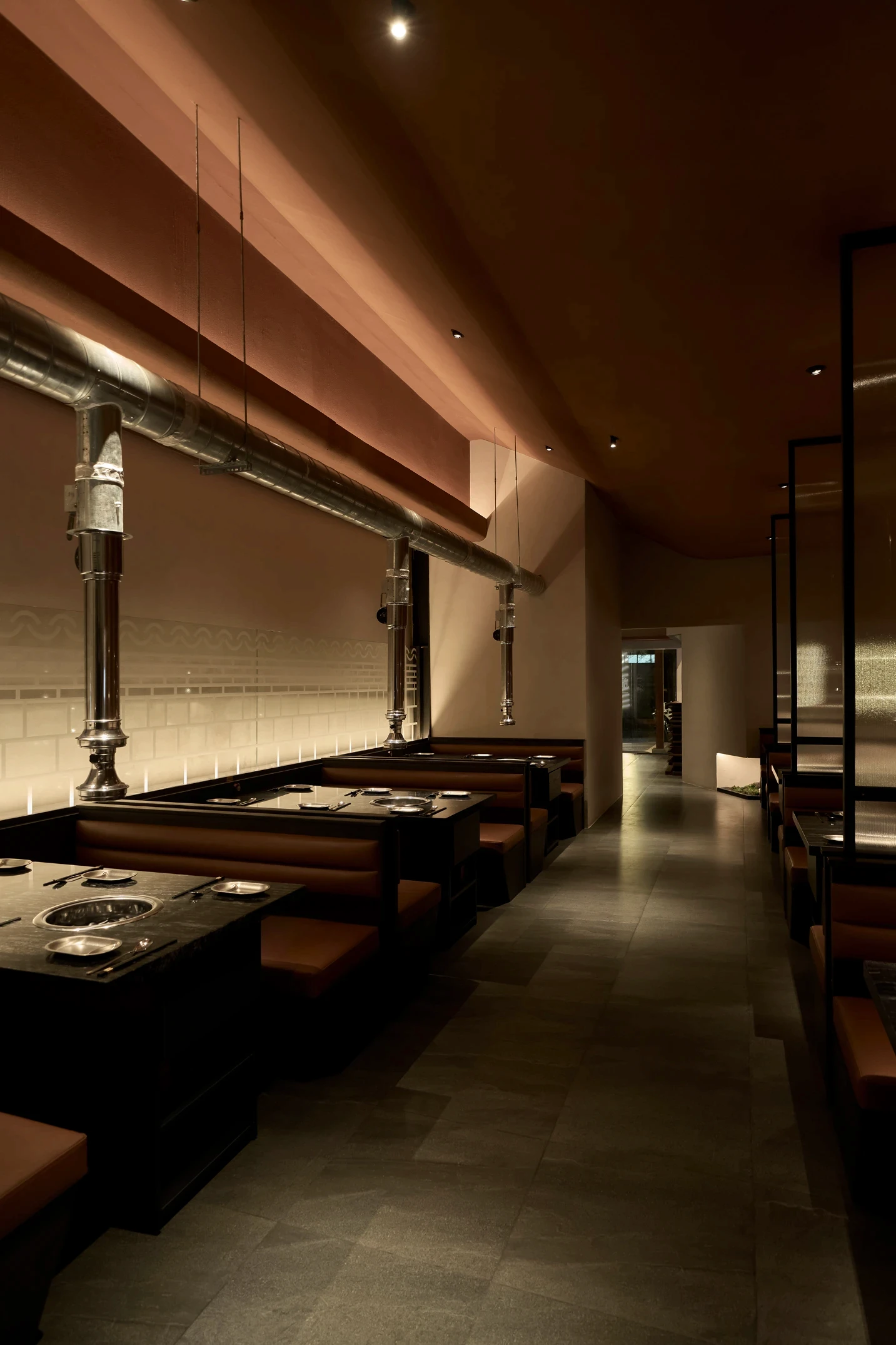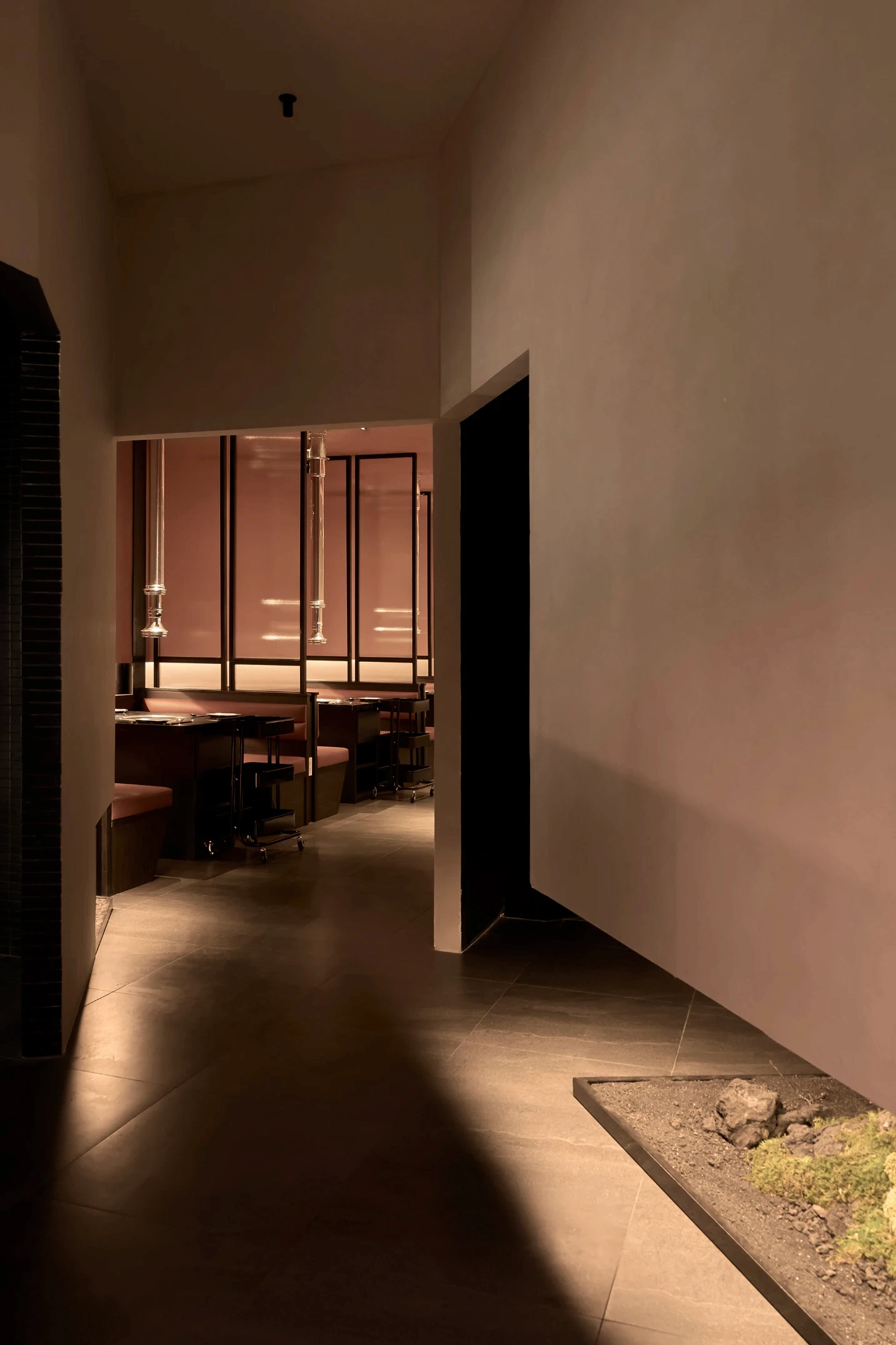 Bước qua khu vực chuyển tiếp, không gian được thu hẹp có chủ ý, tạo cảm giác tĩnh lặng trước khi mở ra khung cảnh rộng rãi bên trong nhà hàng. Giống như một “ngôi làng nhỏ” giữa lòng Sài Gòn, nhà hàng Hàn Quốc Dolgabi mang đến không gian chung để thực khách vừa thưởng thức ẩm thực, vừa giao lưu kết nối. Đồng thời, những “ngôi nhà” nhỏ ở các tầng cao hơn mang đến sự riêng tư cho những ai muốn tìm một góc yên tĩnh hơn.