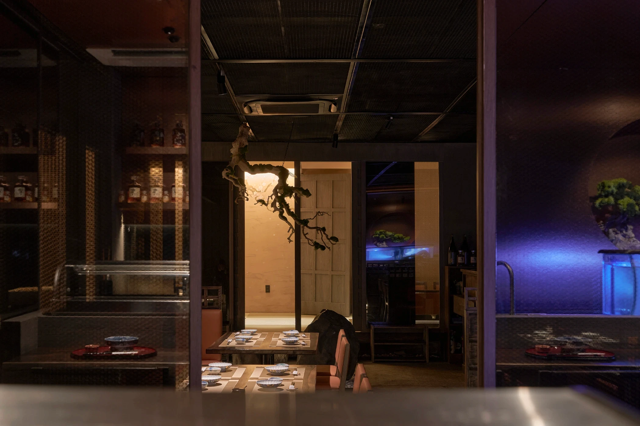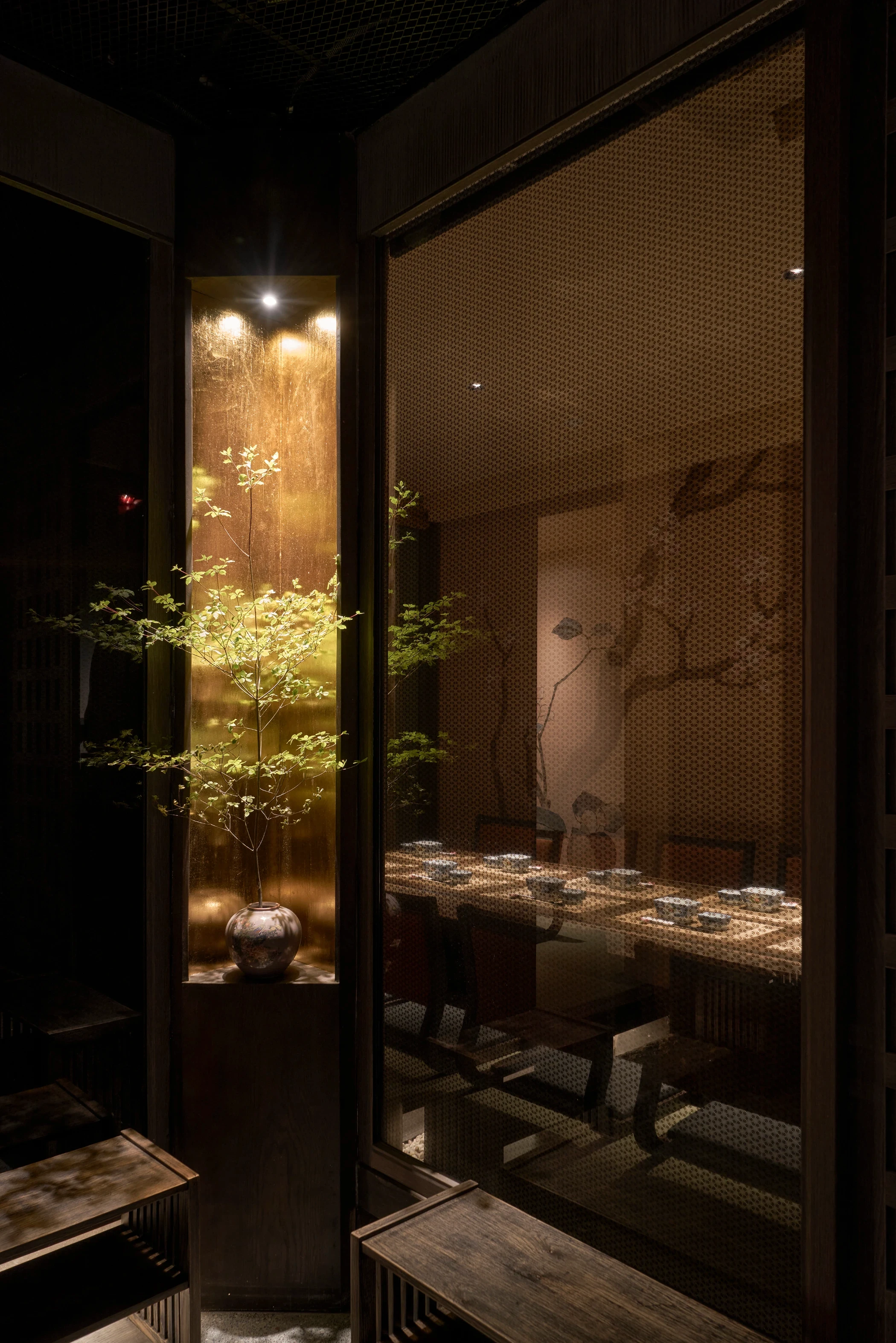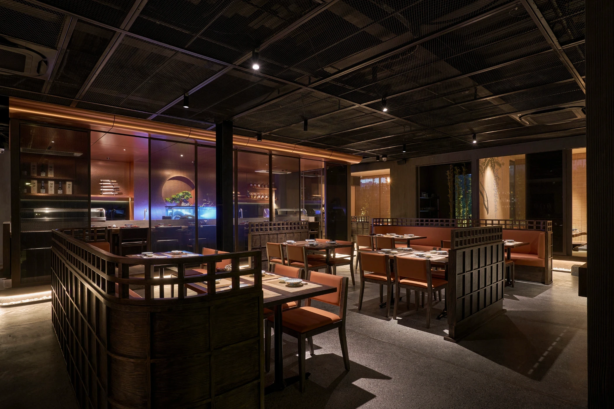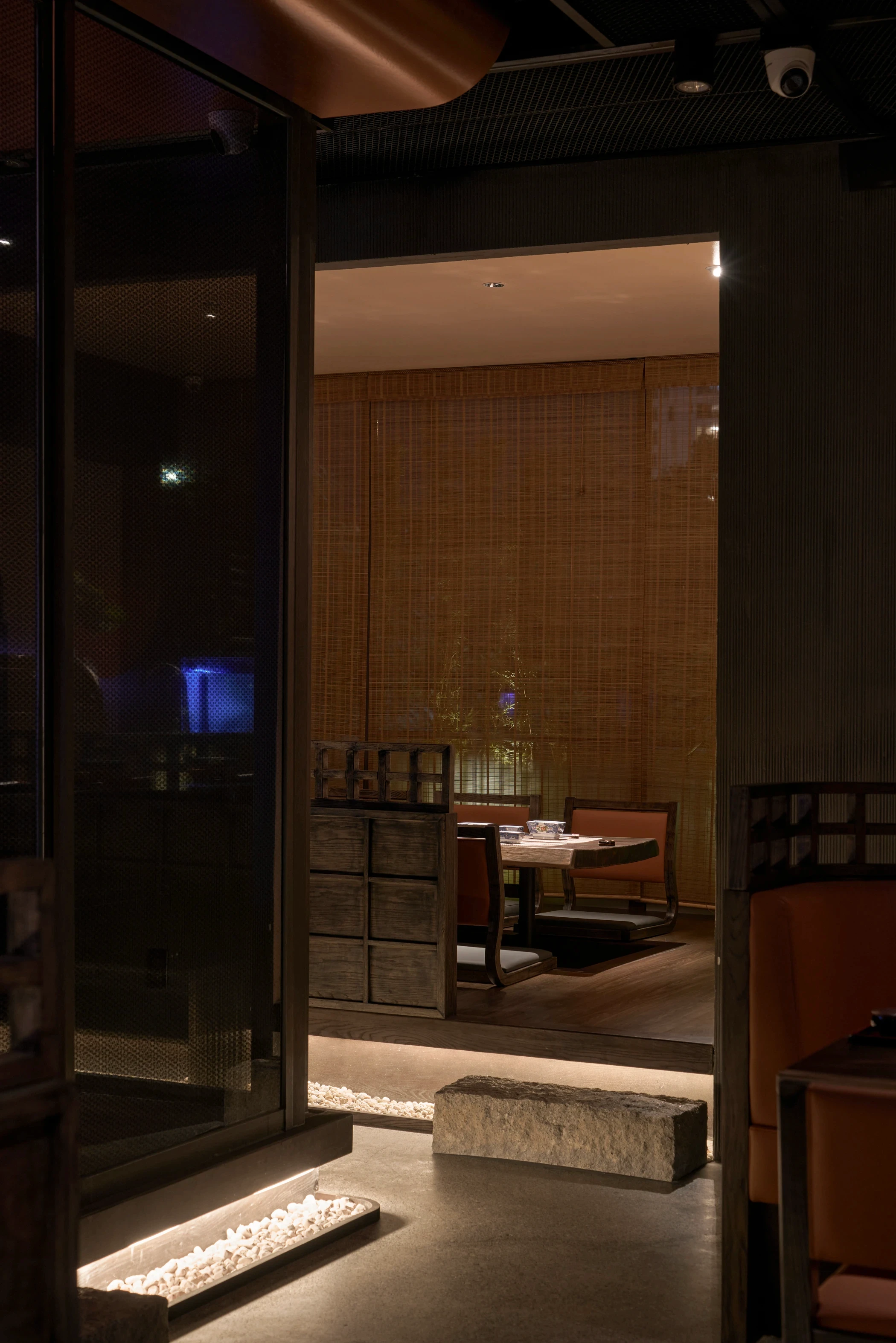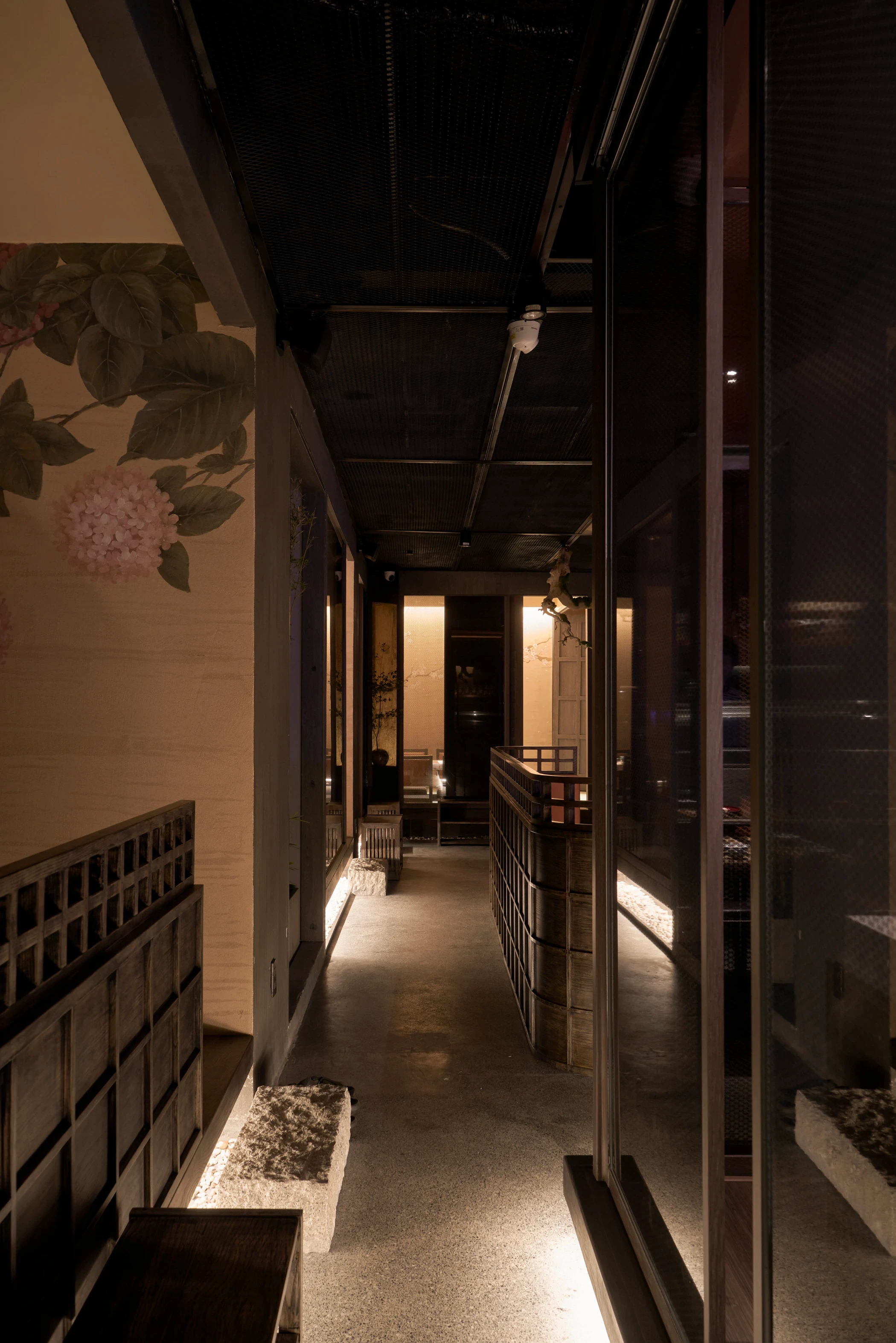 Để không gian đơn giản nhưng không đơn điệu, B.spoke Studio cố gắng tạo ra những chi tiết thú vị ở mỗi không gian. Đầu tiên là cổng ở sảnh đón được lấy cảm hứng từ cổng Torii truyền thống của Nhật, nối liền sau đó là một hành lang dài đóng vai trò chuyển tiếp về không gian - dẫn dắt về mặt cảm xúc và kích thích sự tò mò của thực khách khi tạo cảm giác đi qua một hang đá tĩnh lặng. Đây có thể được xem như là khoảng đệm giúp khách hàng rũ bỏ bớt sự ồn ào bên ngoài để đến với không gian ẩm thực tinh tế .