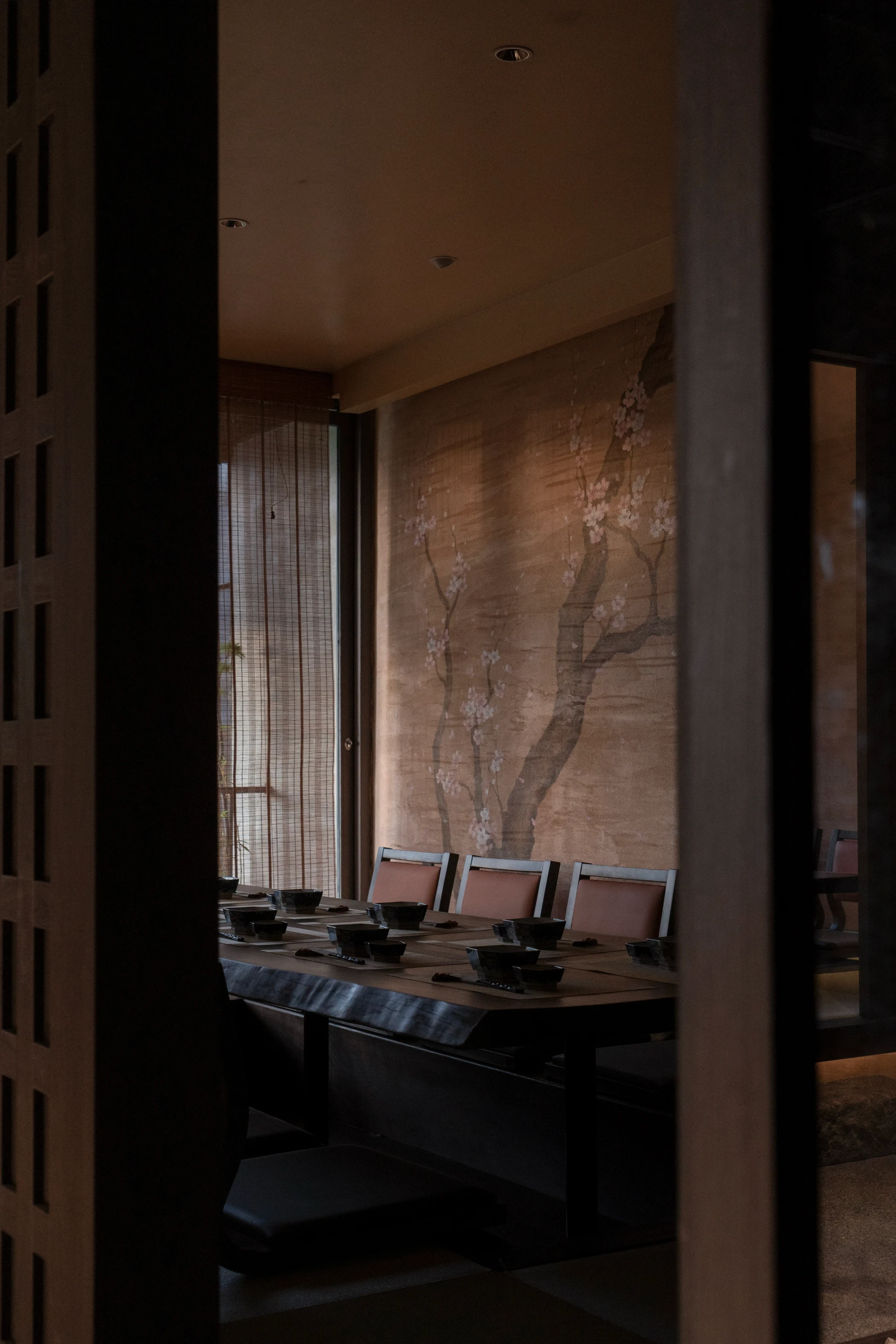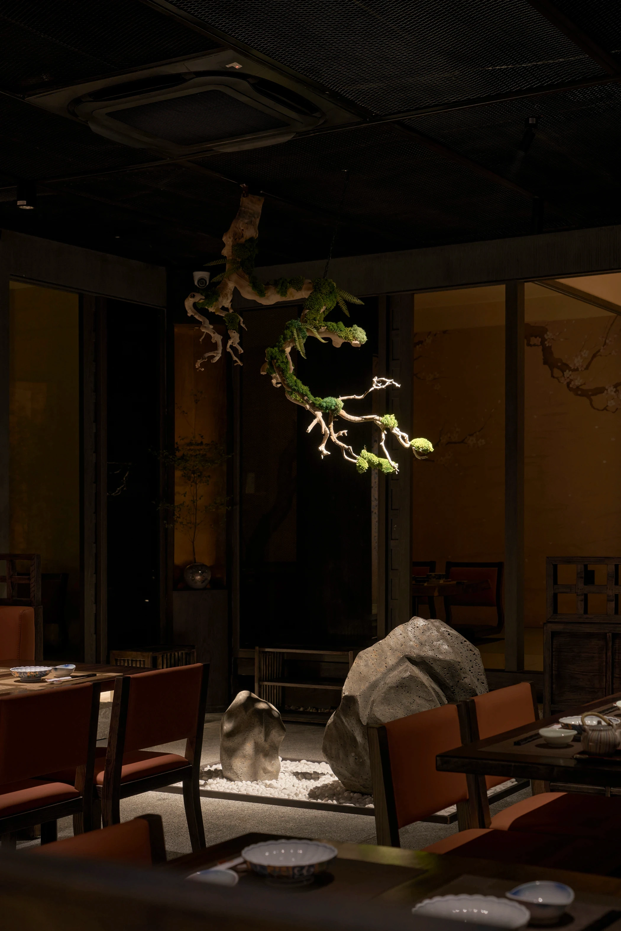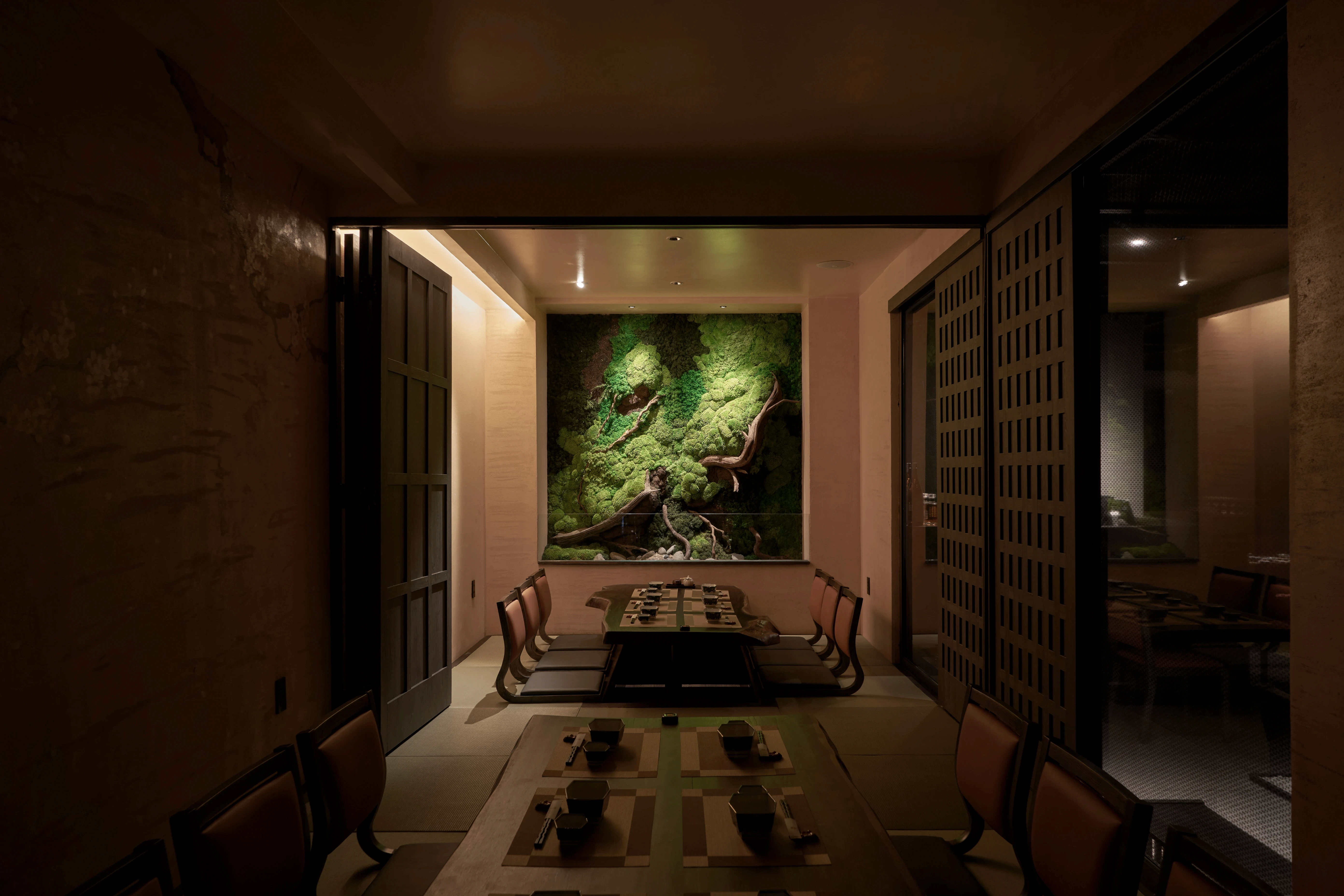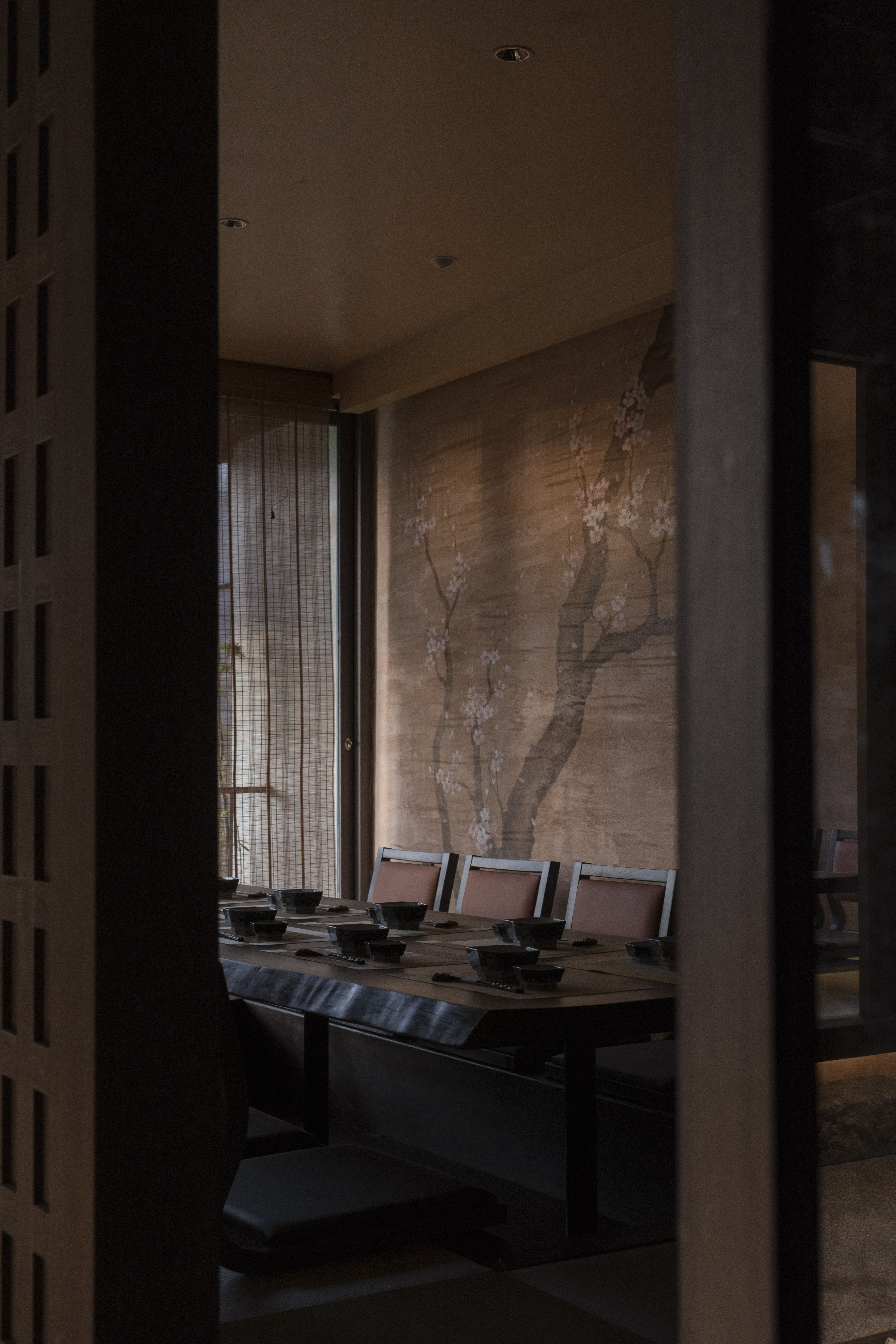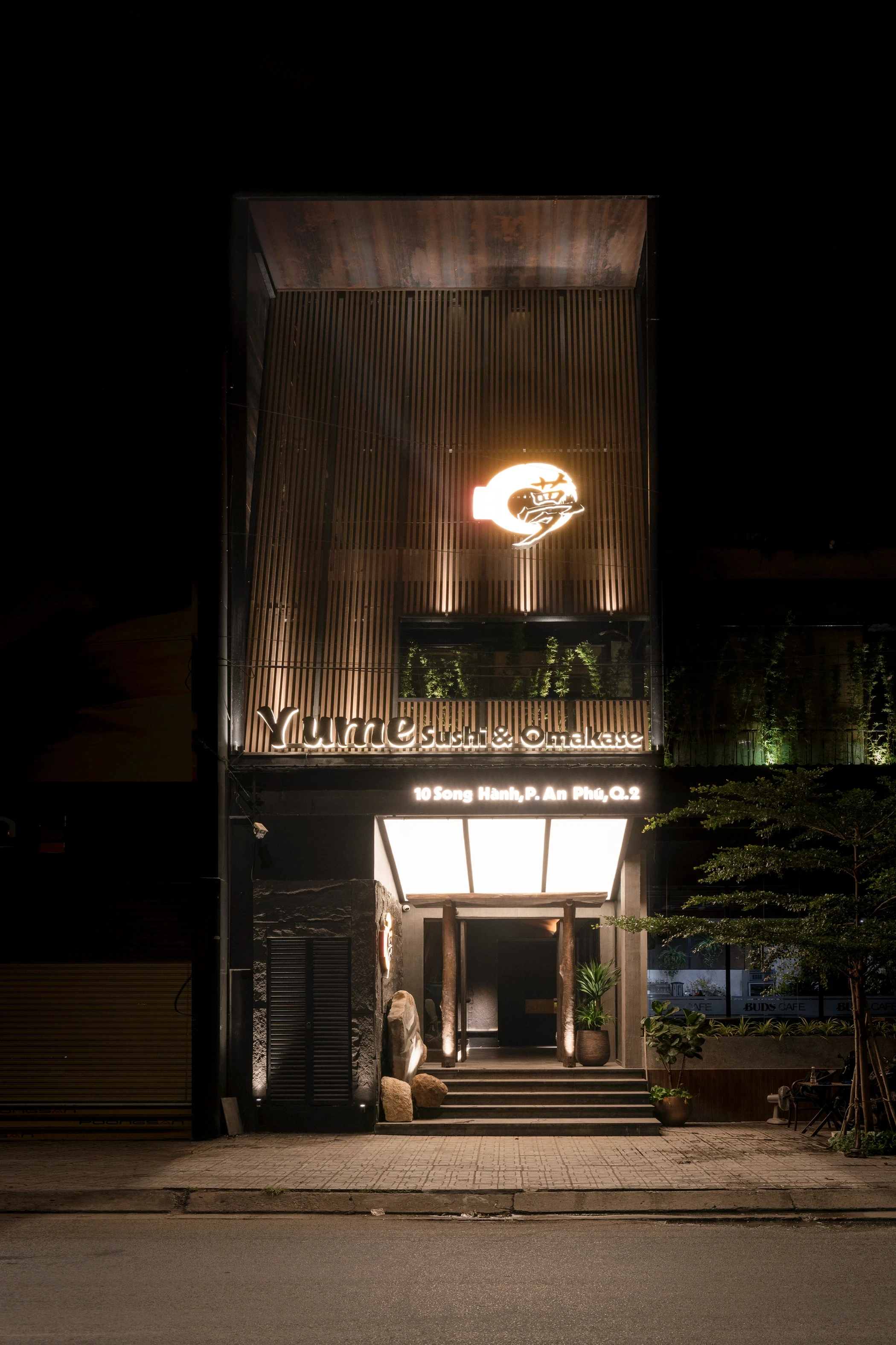 Để không gian đơn giản nhưng không đơn điệu, B.spoke Studio cố gắng tạo ra những chi tiết thú vị ở mỗi không gian. Đầu tiên là cổng ở sảnh đón được lấy cảm hứng từ cổng Torii truyền thống của Nhật, nối liền sau đó là một hành lang dài đóng vai trò chuyển tiếp về không gian - dẫn dắt về mặt cảm xúc và kích thích sự tò mò của thực khách khi tạo cảm giác đi qua một hang đá tĩnh lặng. Đây có thể được xem như là khoảng đệm giúp khách hàng rũ bỏ bớt sự ồn ào bên ngoài để đến với không gian ẩm thực tinh tế .