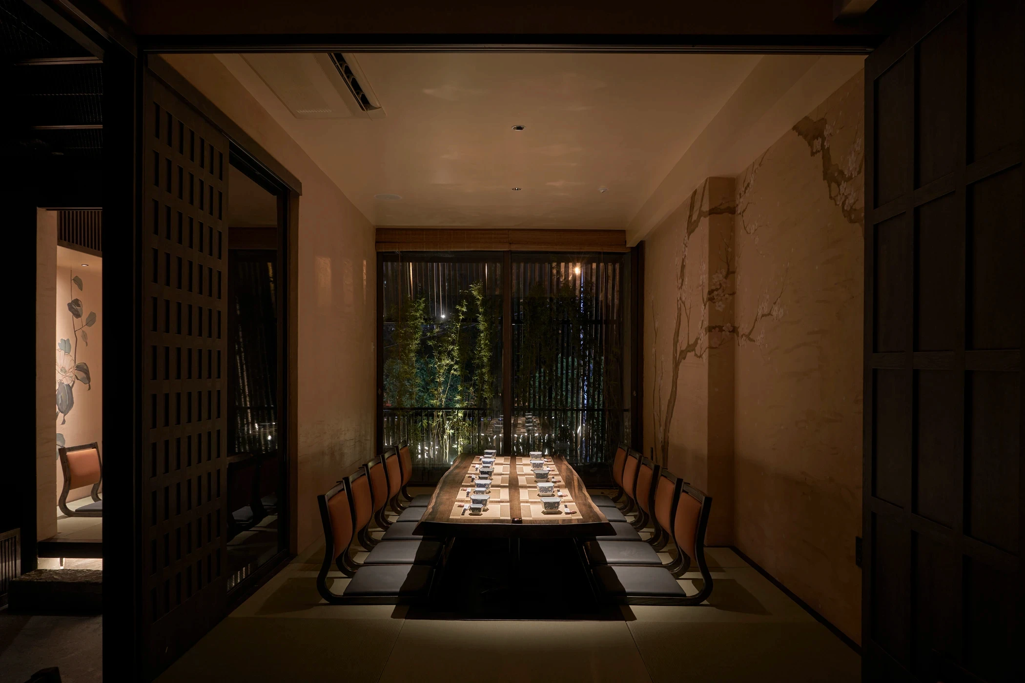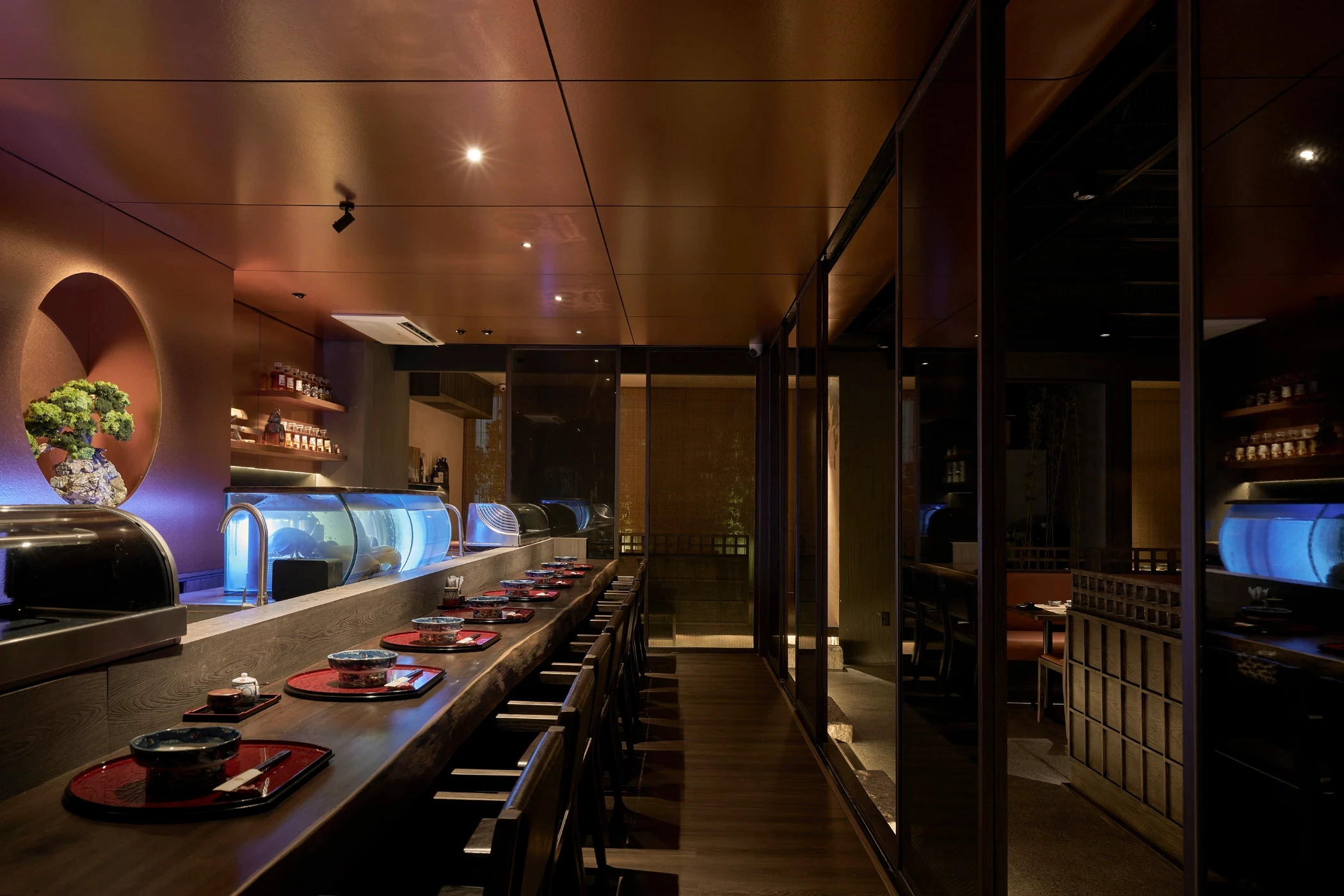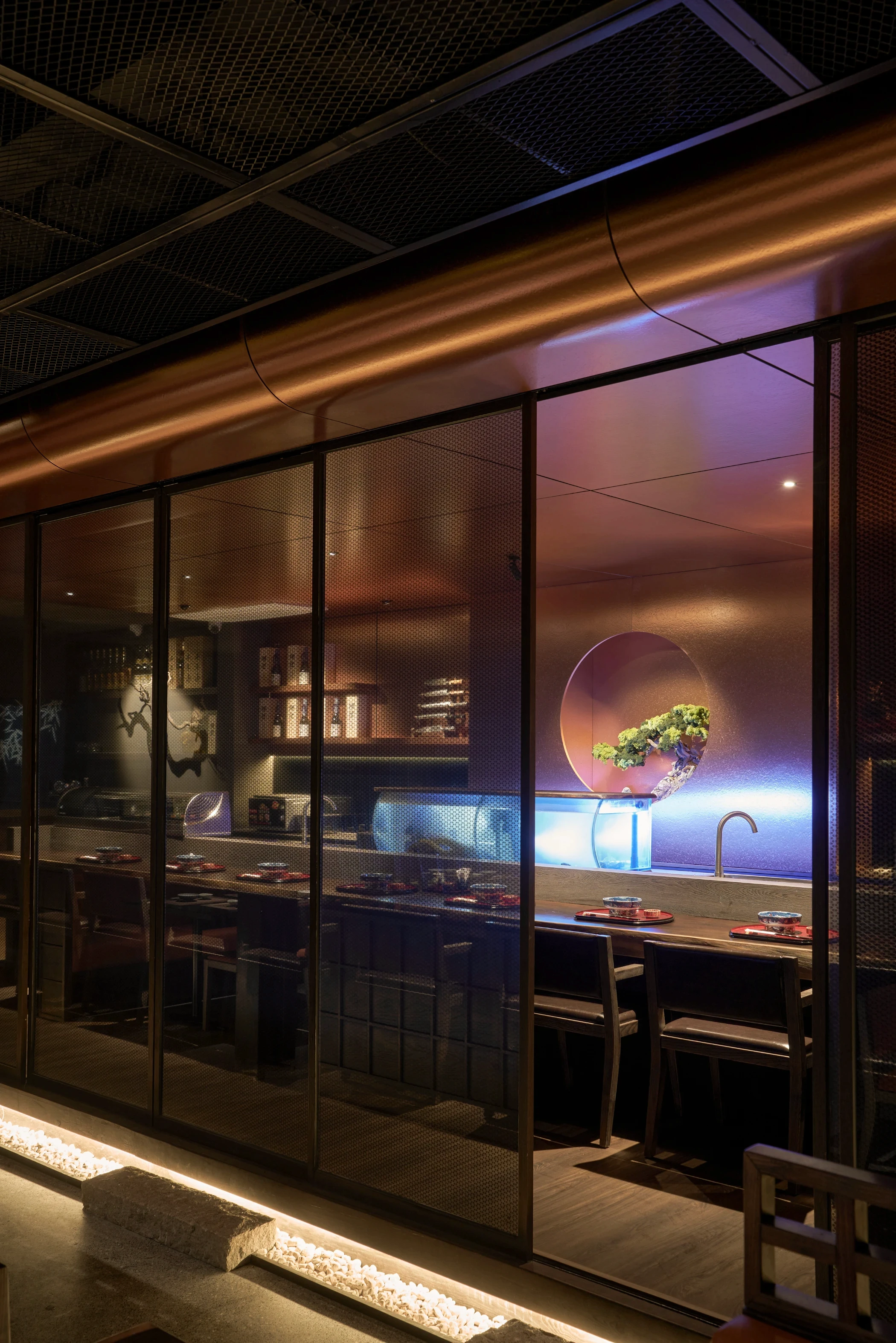 Quầy Omakase nổi bật lên giữa không gian bằng vật liệu đồng đỏ và đường cong mạnh mẽ nối liền từ vách lên trần, biến nó trở thành một sân khấu dành riêng cho người đầu bếp, là nơi thực khách dù ngồi ở vị trí nào trong nhà hàng cũng có thể thưởng thức được “màn trình diễn” đó.