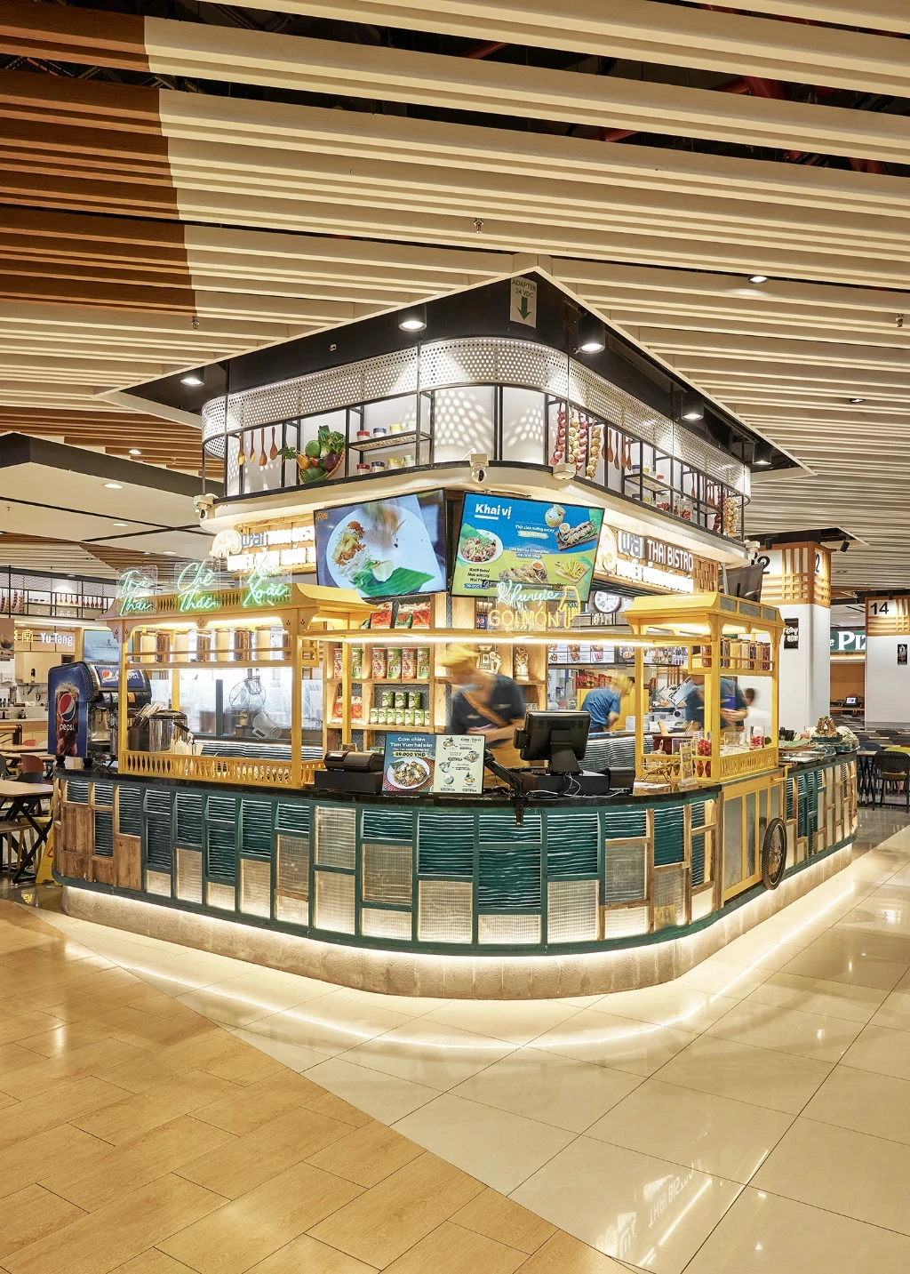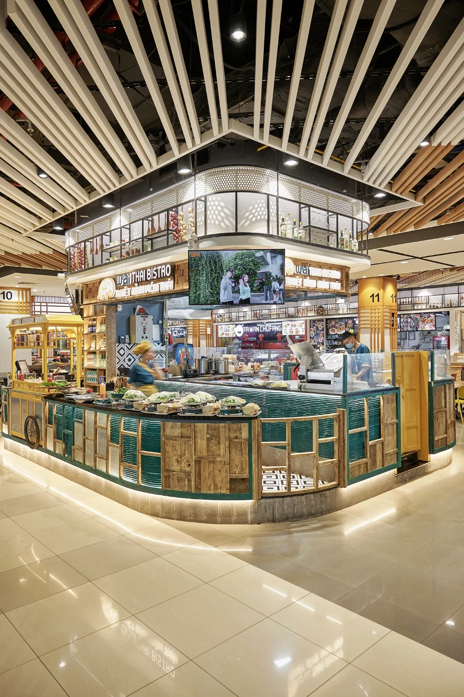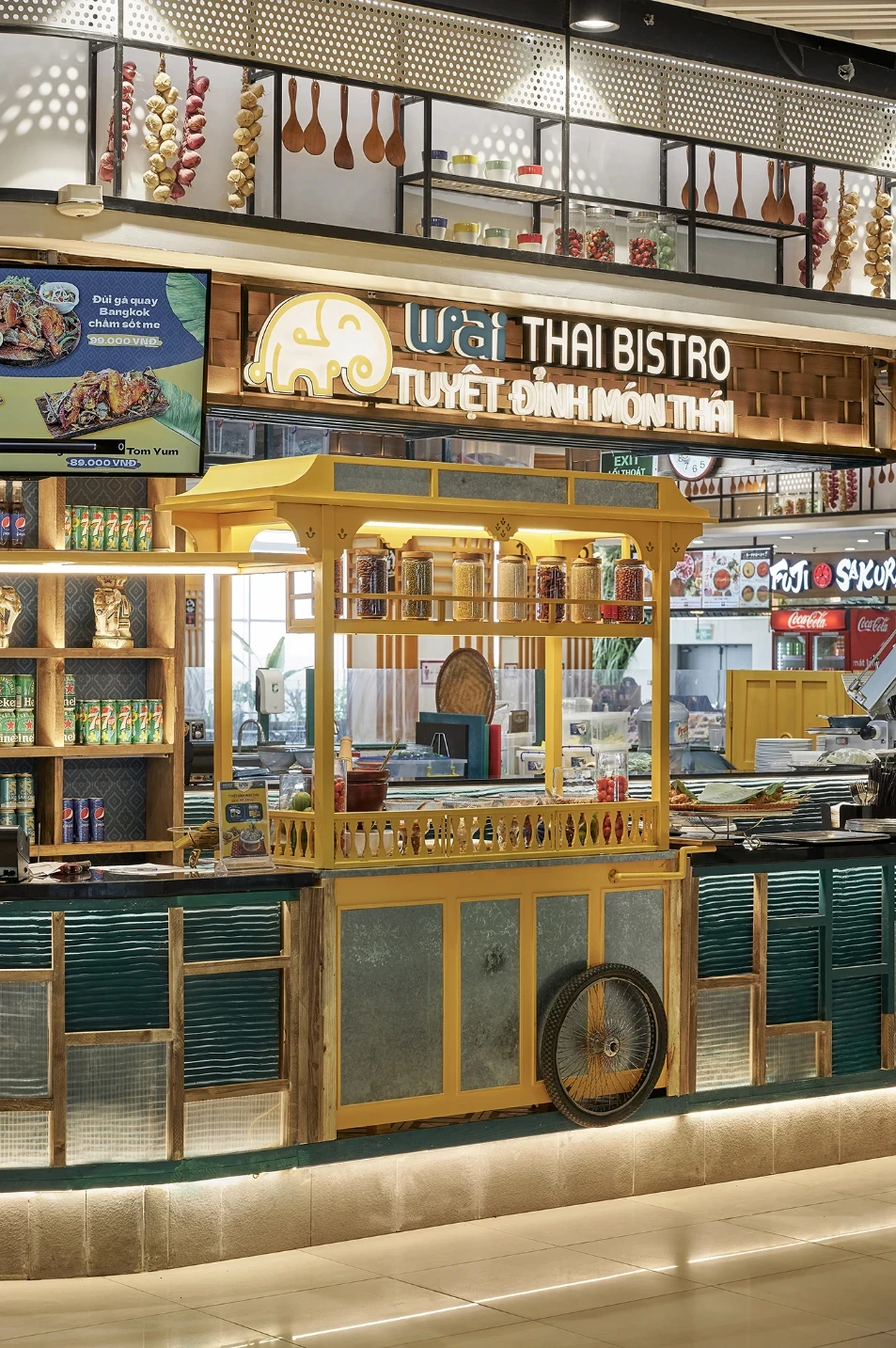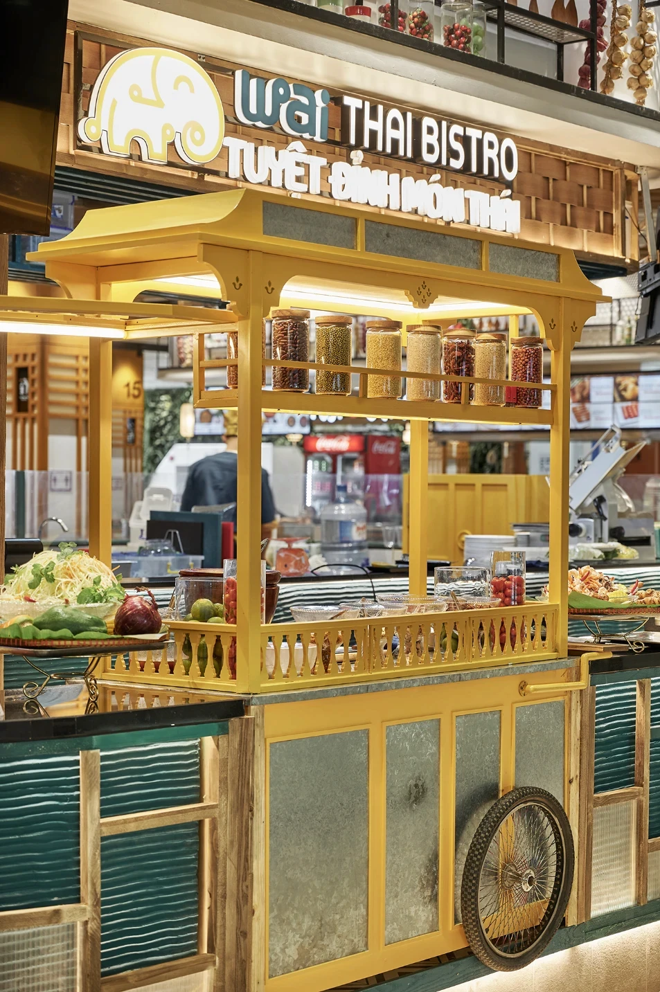 Gian hàng ẩm thực Thái Lan được thiết kế như một góc nhỏ rộn ràng giữa chợ đêm Bangkok – nơi sắc vàng tươi và xanh ngọc đặc trưng hòa quyện trong không gian đầy năng lượng. Cảm hứng đến từ những xe đẩy đường phố, món ăn nóng hổi và tiếng cười rôm rả, tạo nên một trải nghiệm chân thật và vui tươi. Không quá cầu kỳ, nơi đây mang đến cảm giác gần gũi, thơm nồng và sống động như chính tinh thần ẩm thực đường phố Thái – phóng khoáng, đậm vị và chan chứa niềm vui.