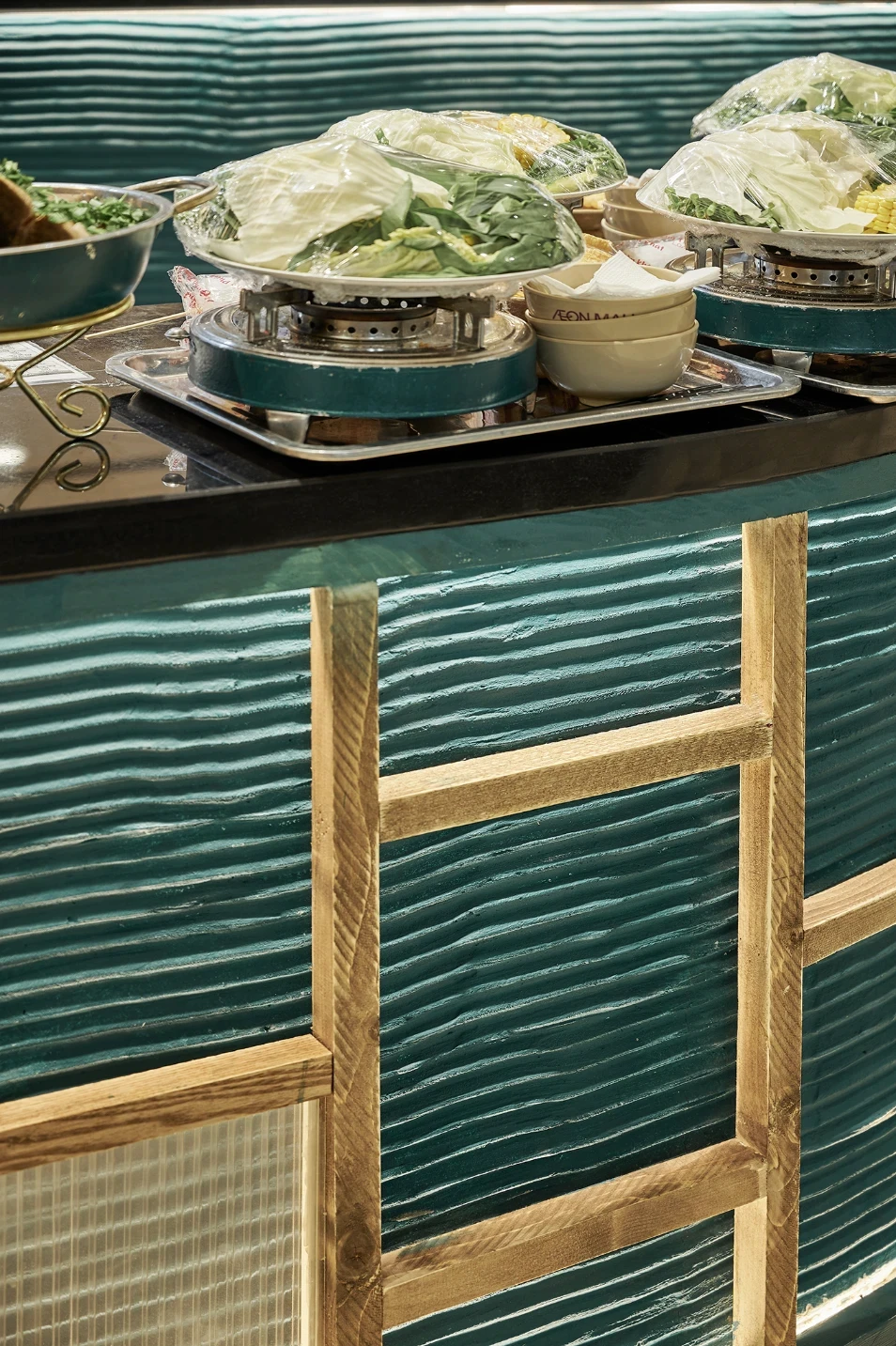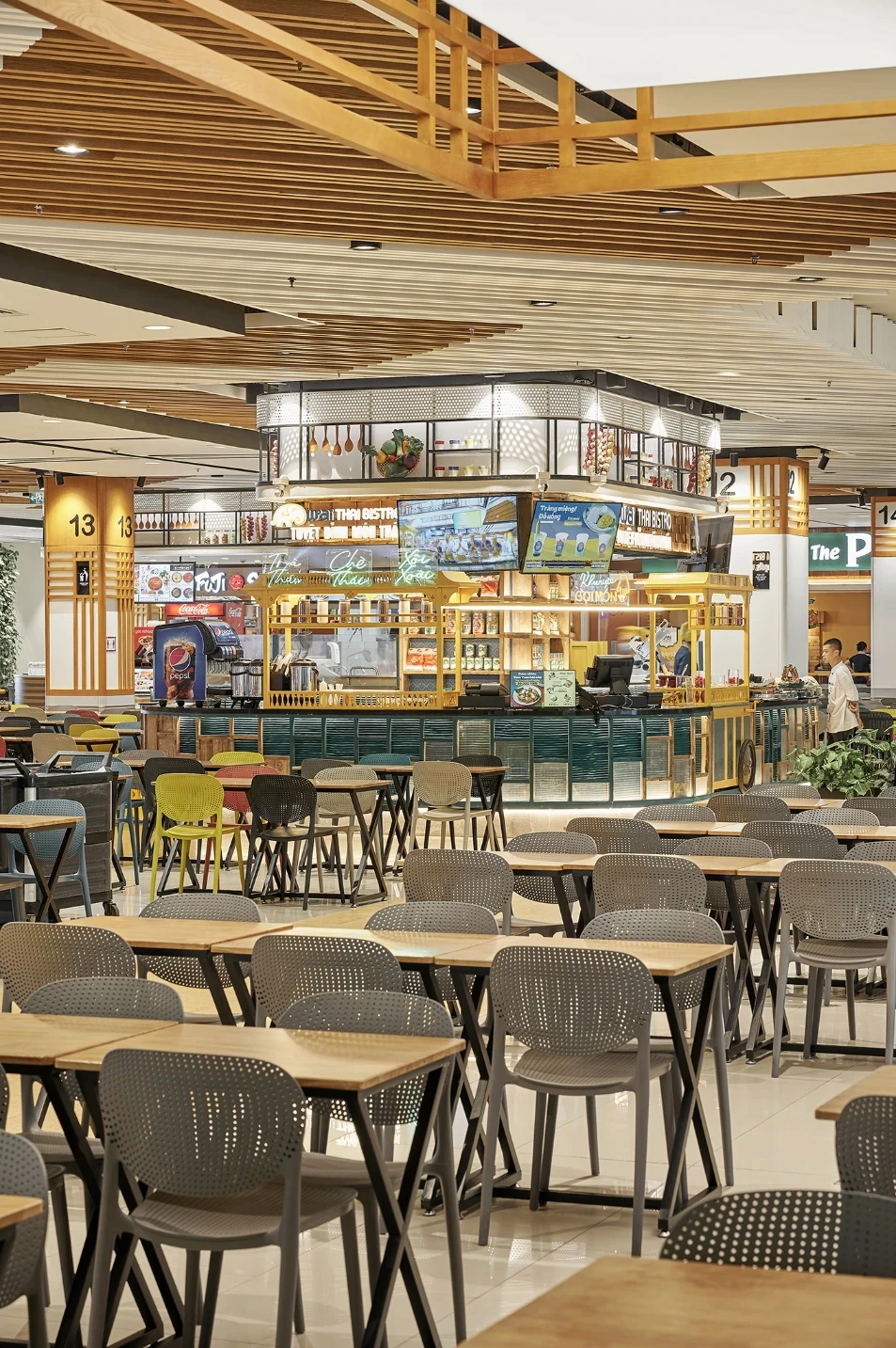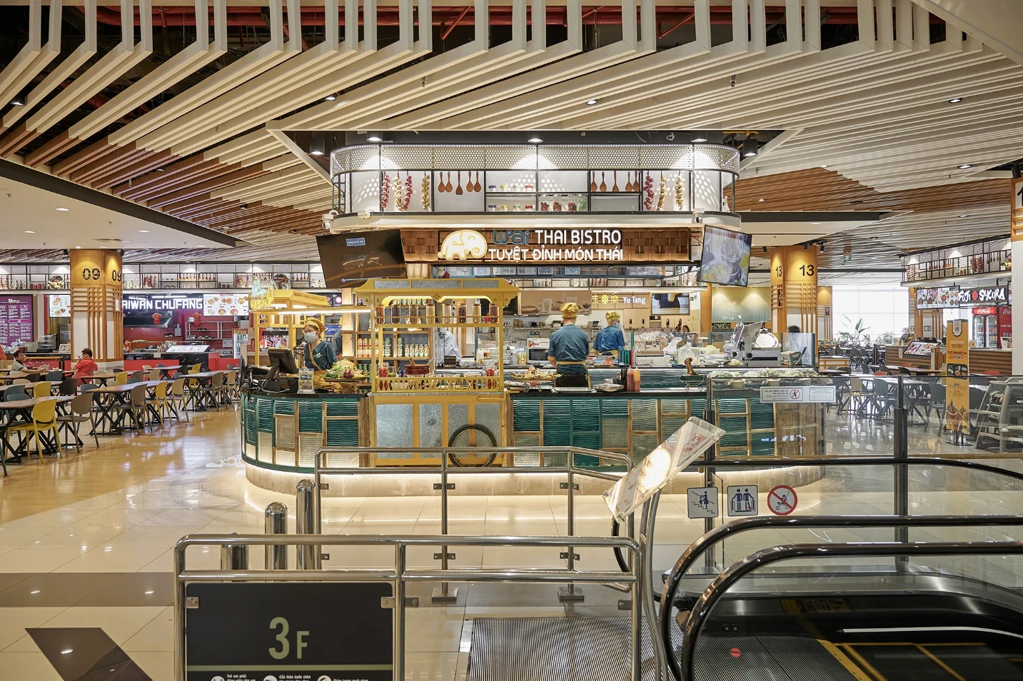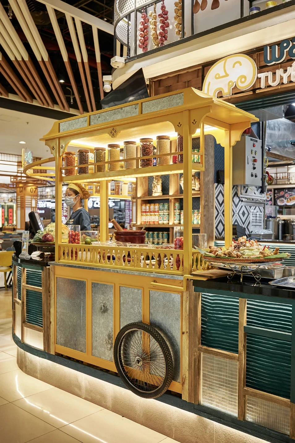 Gian hàng ẩm thực Thái Lan được thiết kế như một góc nhỏ rộn ràng giữa chợ đêm Bangkok – nơi sắc vàng tươi và xanh ngọc đặc trưng hòa quyện trong không gian đầy năng lượng. Cảm hứng đến từ những xe đẩy đường phố, món ăn nóng hổi và tiếng cười rôm rả, tạo nên một trải nghiệm chân thật và vui tươi. Không quá cầu kỳ, nơi đây mang đến cảm giác gần gũi, thơm nồng và sống động như chính tinh thần ẩm thực đường phố Thái – phóng khoáng, đậm vị và chan chứa niềm vui.