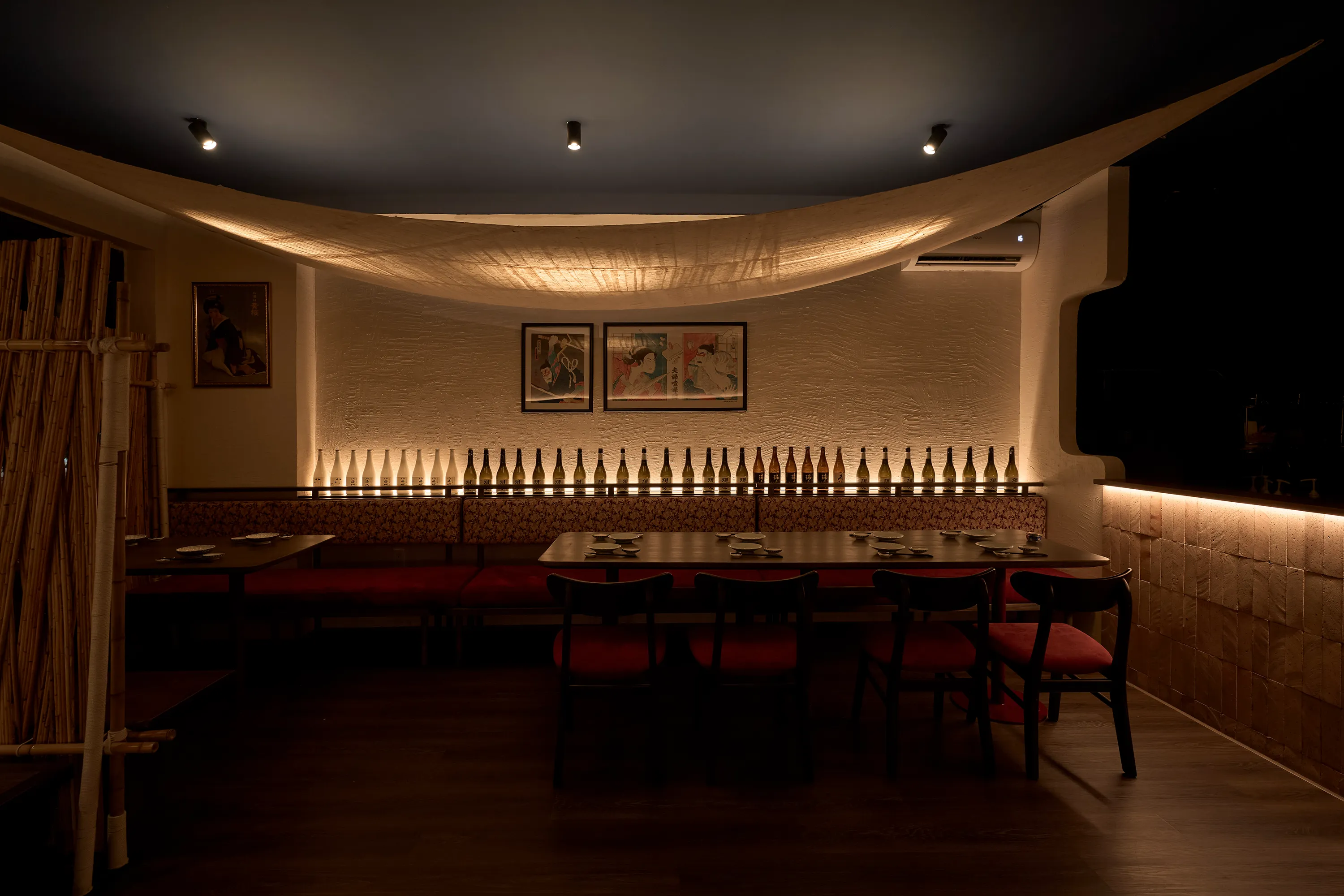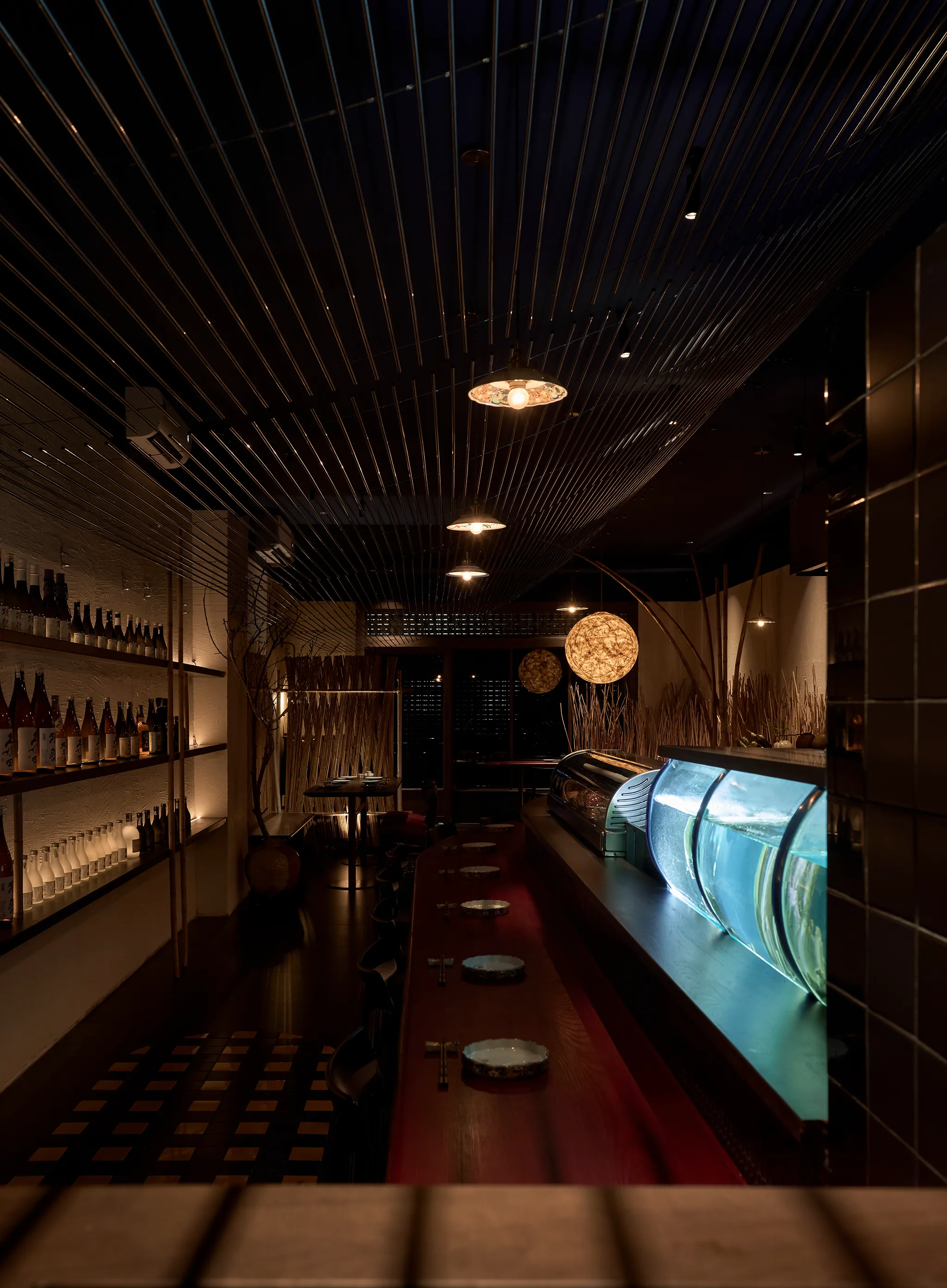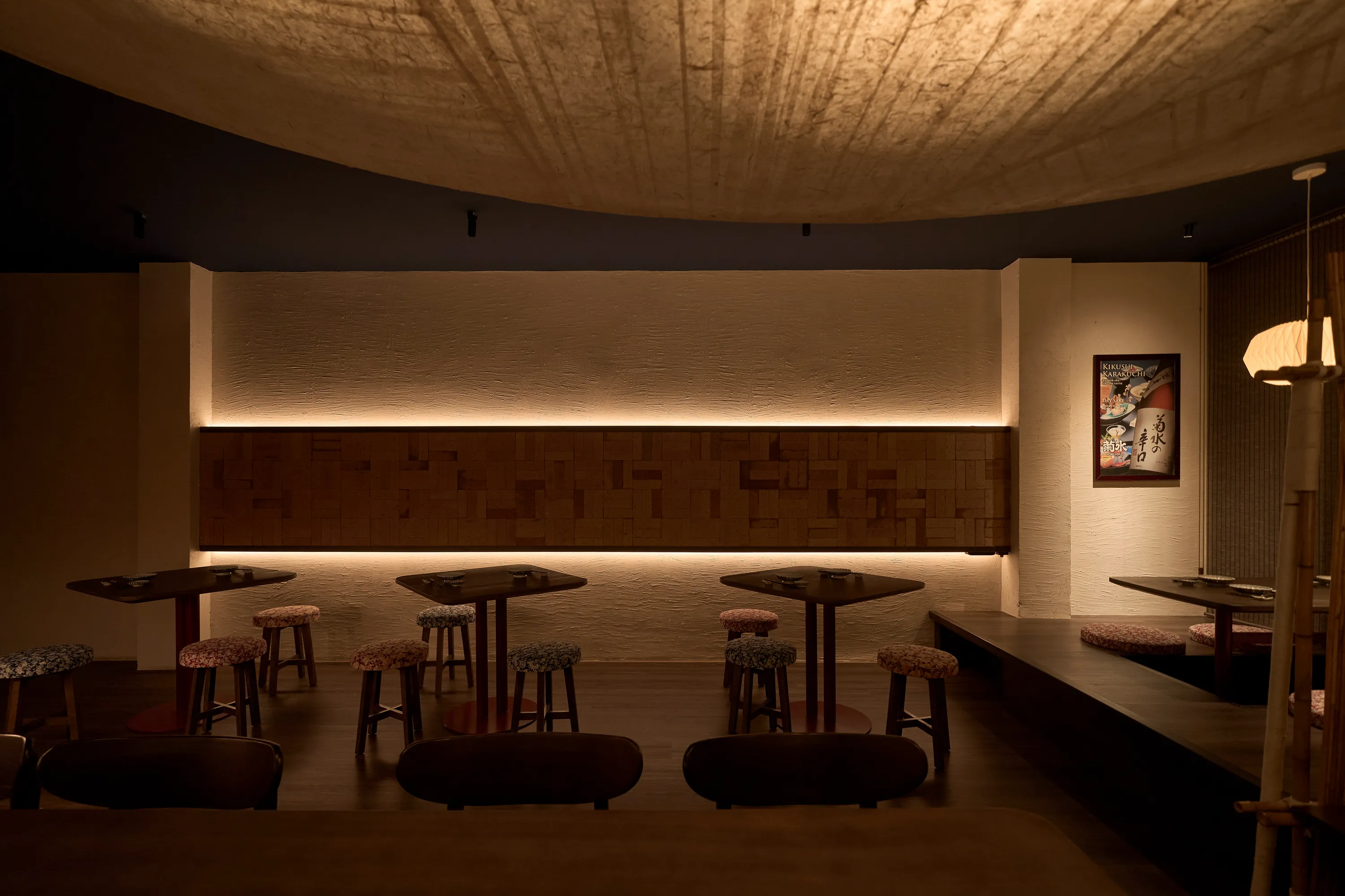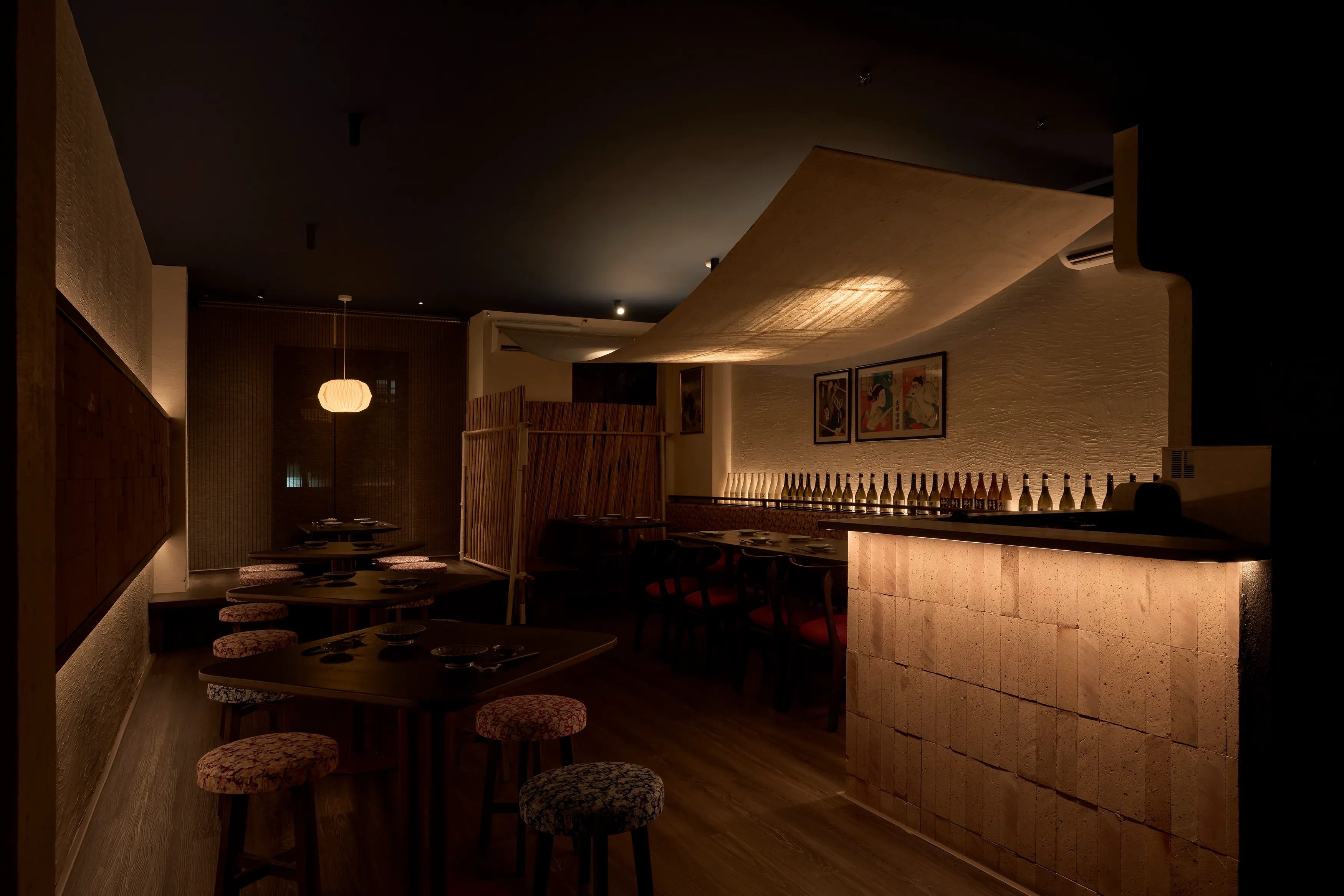 Concept lấy cảm hứng từ một buổi chiều tà cắm trại trong rừng. Nơi này giống như một túp lều vừa đủ nhỏ để một nhóm bạn hoặc gia đình có thể quây quần, chia sẻ với nhau vài câu chuyện ấm cúng thân mật. Phần trần trang trí bằng kim loại nhằm tạo ra sự tương phản về vật liệu và tạo một chút hiệu ứng cho không gian.