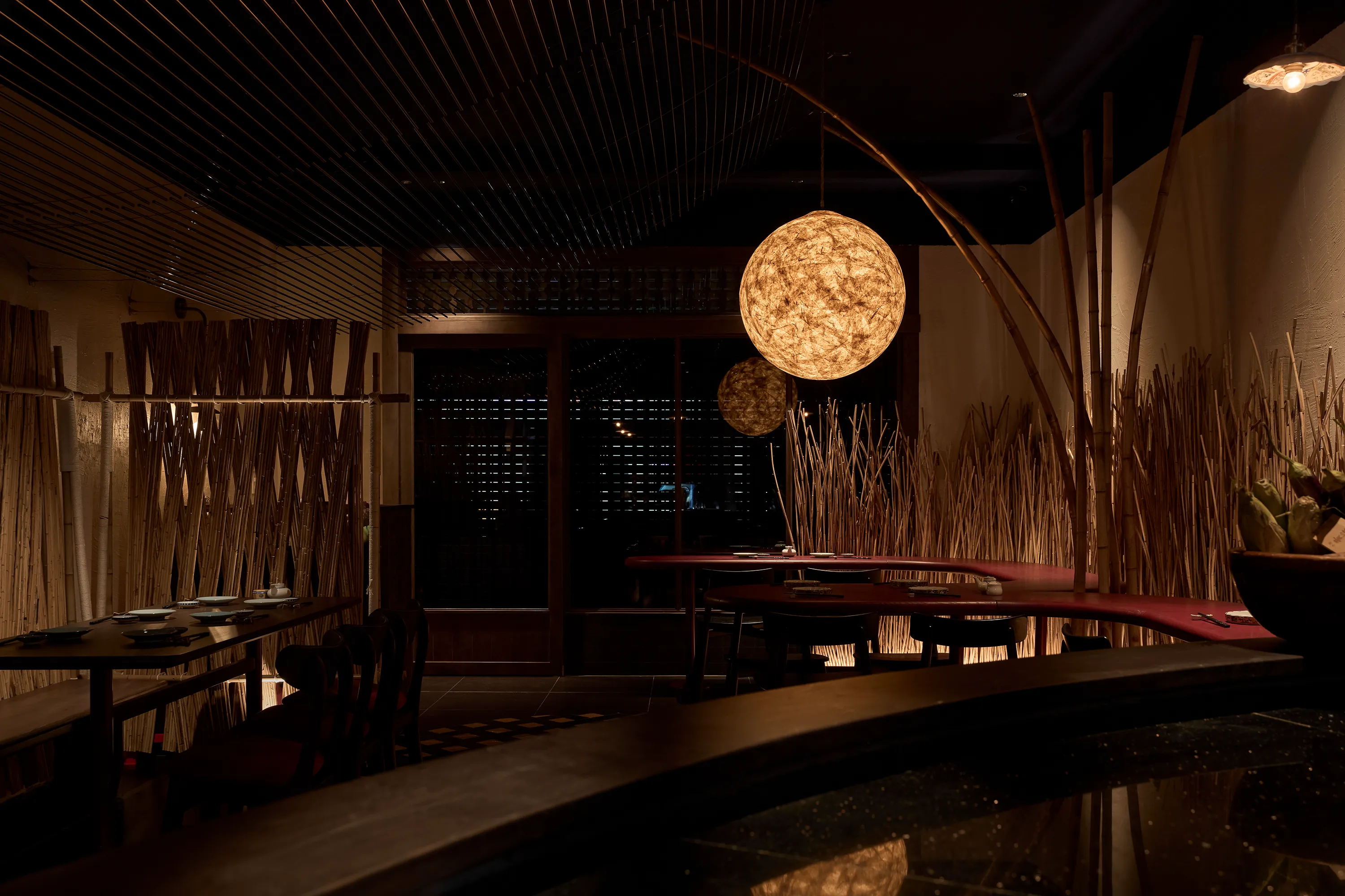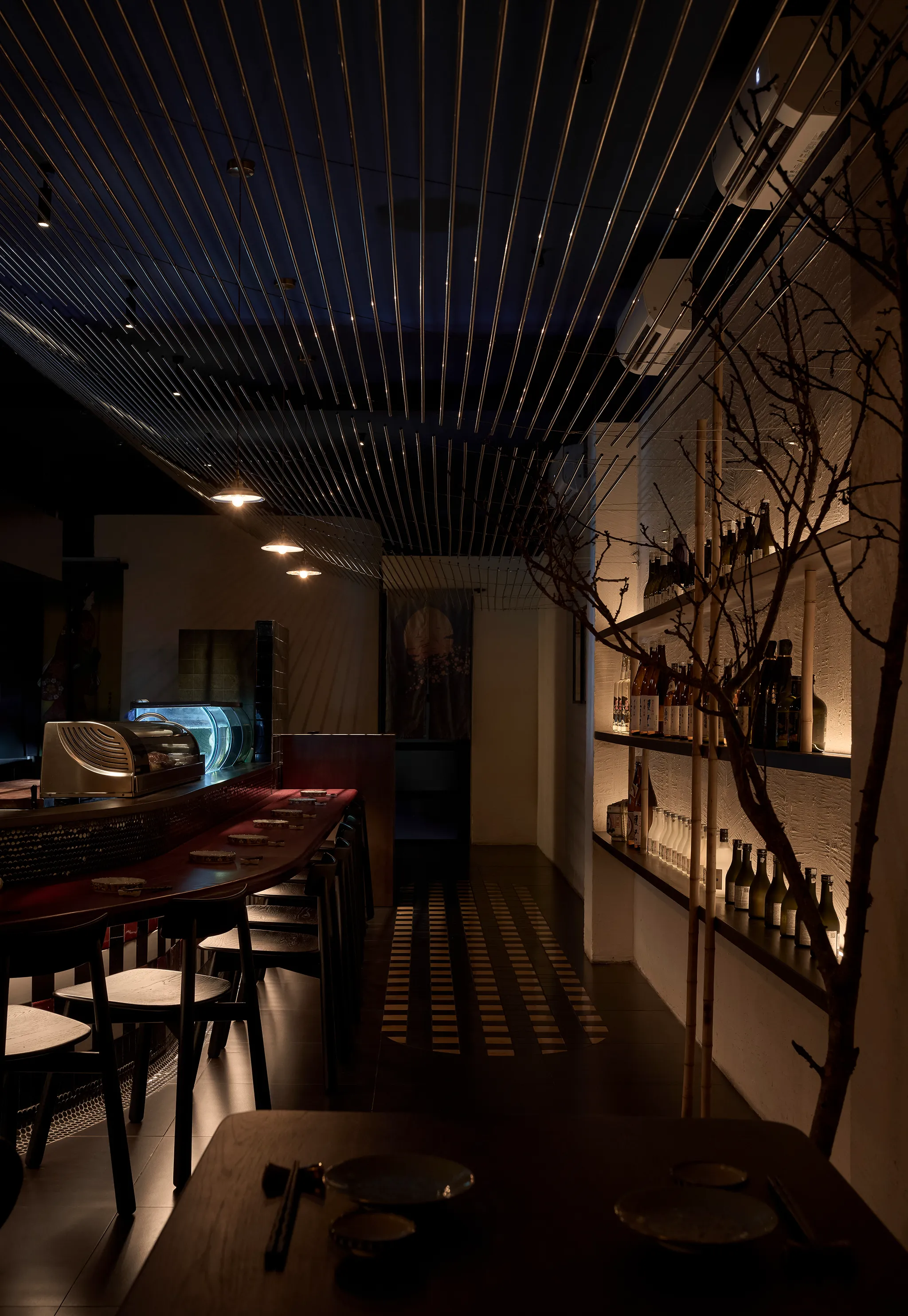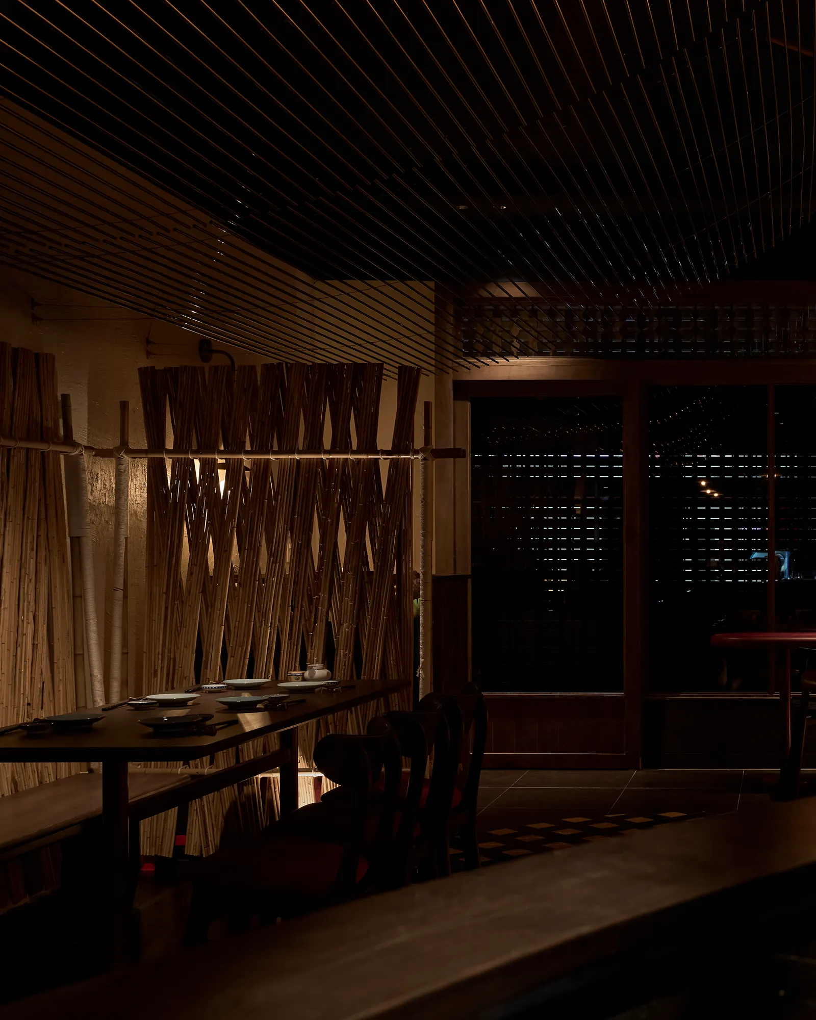 Concept lấy cảm hứng từ một buổi chiều tà cắm trại trong rừng. Nơi này giống như một túp lều vừa đủ nhỏ để một nhóm bạn hoặc gia đình có thể quây quần, chia sẻ với nhau vài câu chuyện ấm cúng thân mật. Phần trần trang trí bằng kim loại nhằm tạo ra sự tương phản về vật liệu và tạo một chút hiệu ứng cho không gian.